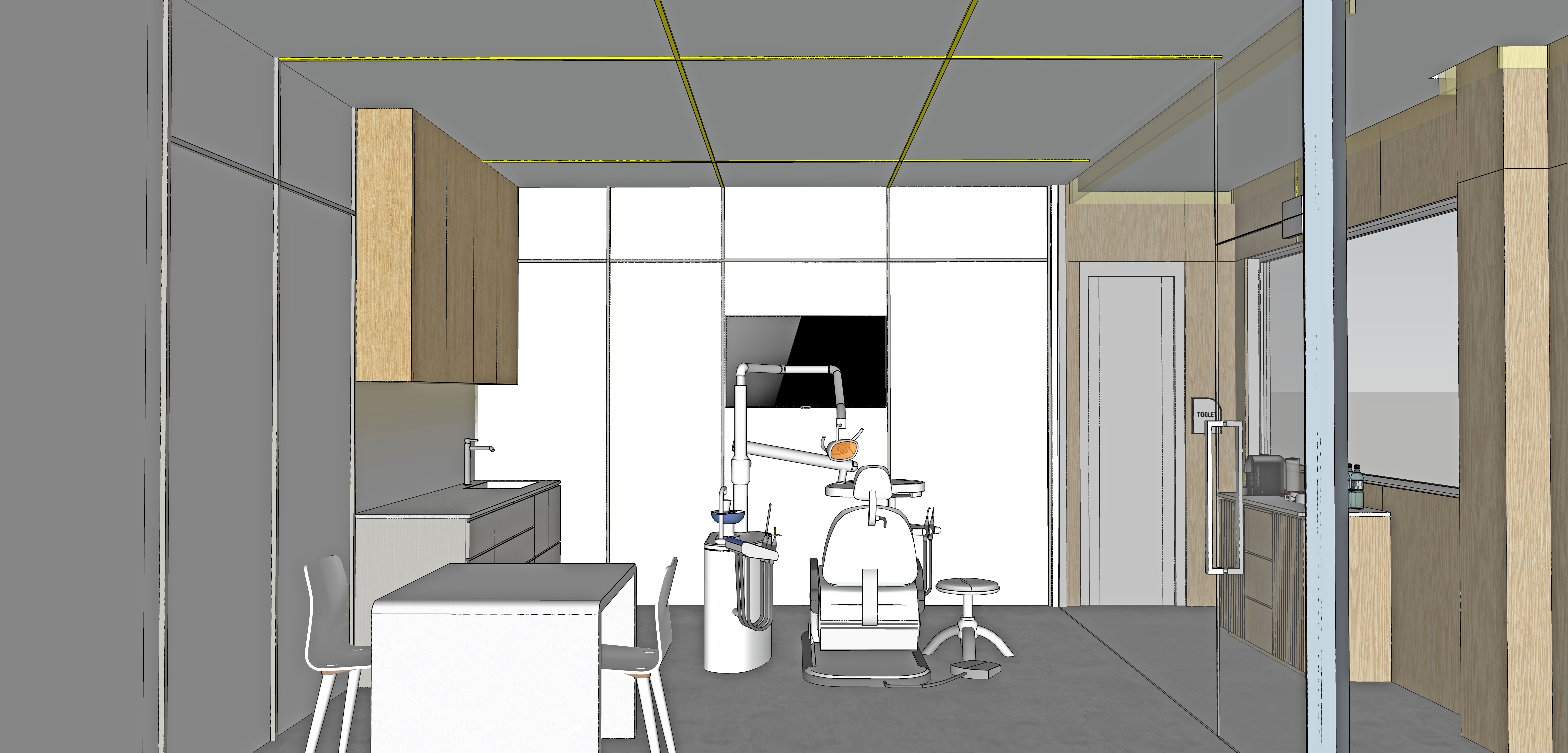 interior shot minimalist dental room clean and modern looks there is hpl vertical list panel in the wall led strip lighting in the ceiling an transparent glass wall in the right side beautiful lighting render there is a table in the left side