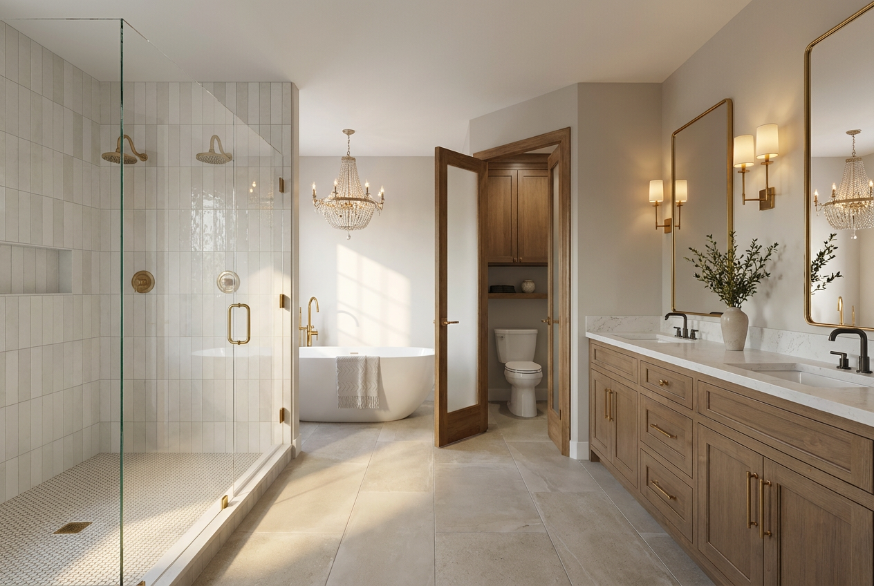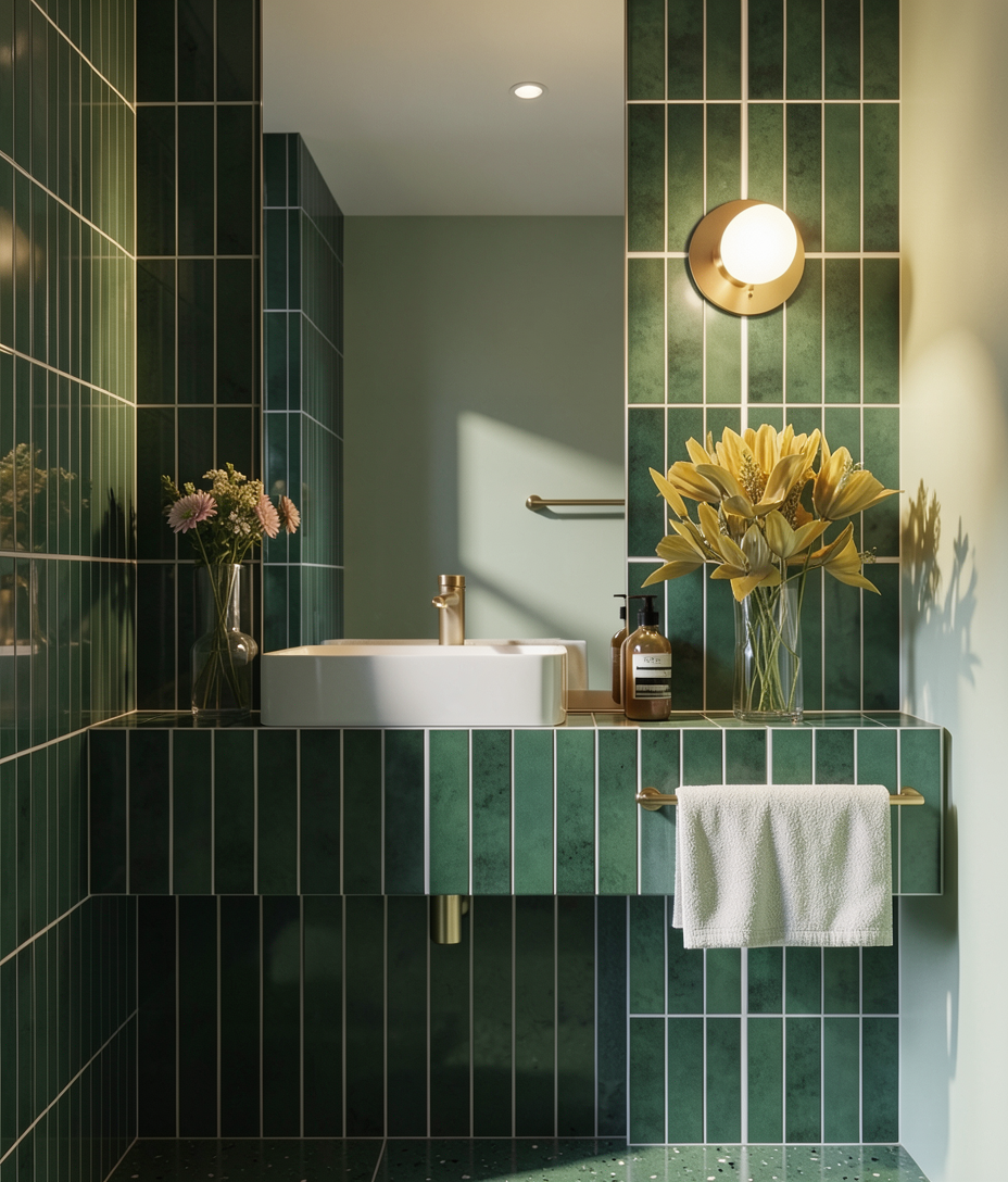 photorealistic architectural render of a bathroom vanity using the provided reference image as a strict blueprint exact front facing view eye level camera perfectly centered composition no perspective distortion no reinterpretation recreate the scene exactly as in the reference image preserving all geometry proportions alignment and object placement without any modification the result must look like a real photograph of the same design not a redesigned version mandatory elements must all be present and unchanged one large vertical rectangular mirror centered above the sink occupying the full central upper area one white rectangular vessel sink centered on the countertop one brushed gold faucet centered behind the sink one round wall sconce centered on the right vertical tiled strip one glass vase with flowers on the right side of the countertop one soap dispenser next to the vase one single towel rail located only on the front right side of the vanity below the countertop with one hanging towel open void below the vanity vertical tiled strip on the right side behind the sconce left wall fully tiled right wall smooth and painted strict constraints do not remove the mirror do not change its size or position do not add any extra towel rails do not place any towel rail on the right wall do not move or resize any object do not redesign the bathroom do not add decoration or elements not present in the original tiling critical must match original layout exactly vertical rectangular tiles on left wall front of the vanity vertical strip behind the sconce and the entire lower back wall under the vanity must also be tiled in the same pattern tile layout must remain continuous and aligned across all surfaces no gaps no missing tiling no painted areas where tiles exist in the reference materials tiles glossy ceramic vertical rectangular format deep desaturated green subtle tonal variation fine rectified joints soft reflections right wall matte painted surface light desaturated green same hue but brighter and softer floor green terrazzo 50x50 cm slabs total width 150 cm rectified edges minimal joints fine aggregate satin polished faucet towel rail sconce base brushed gold soft anisotropic reflection sink white ceramic matte or satin mirror clean flat no frame or minimal edge vase transparent glass with thickness and refraction flowers natural slightly imperfect towel soft fabric visible texture natural folds mirror behavior critical physically correct subtle reflection no wide angle distortion no exaggerated depth no shifted perspective reflection must align with a perfectly frontal camera and feel optically calm and realistic lighting warm dramatic editorial lighting inspired by high end interior photography strong directional light from upper left warm 2700k 3000k long soft shadows with clear direction wall sconce emits a soft warm glow but is secondary soft bounce light on the painted right wall enhance gloss on tiles and warm highlights on brushed gold atmosphere intimate refined cinematic quality ultra realistic 4k ray tracing global illumination physically accurate materials sharp textures no cgi look no stylization negative prompt missing mirror distorted mirror incorrect reflection perspective distortion untiled lower wall extra towel rail towel rail on right wall altered layout redesigned bathroom added objects changed proportions misaligned tiles gaps in tiling baskets shelves additional lights overexposure flat lighting