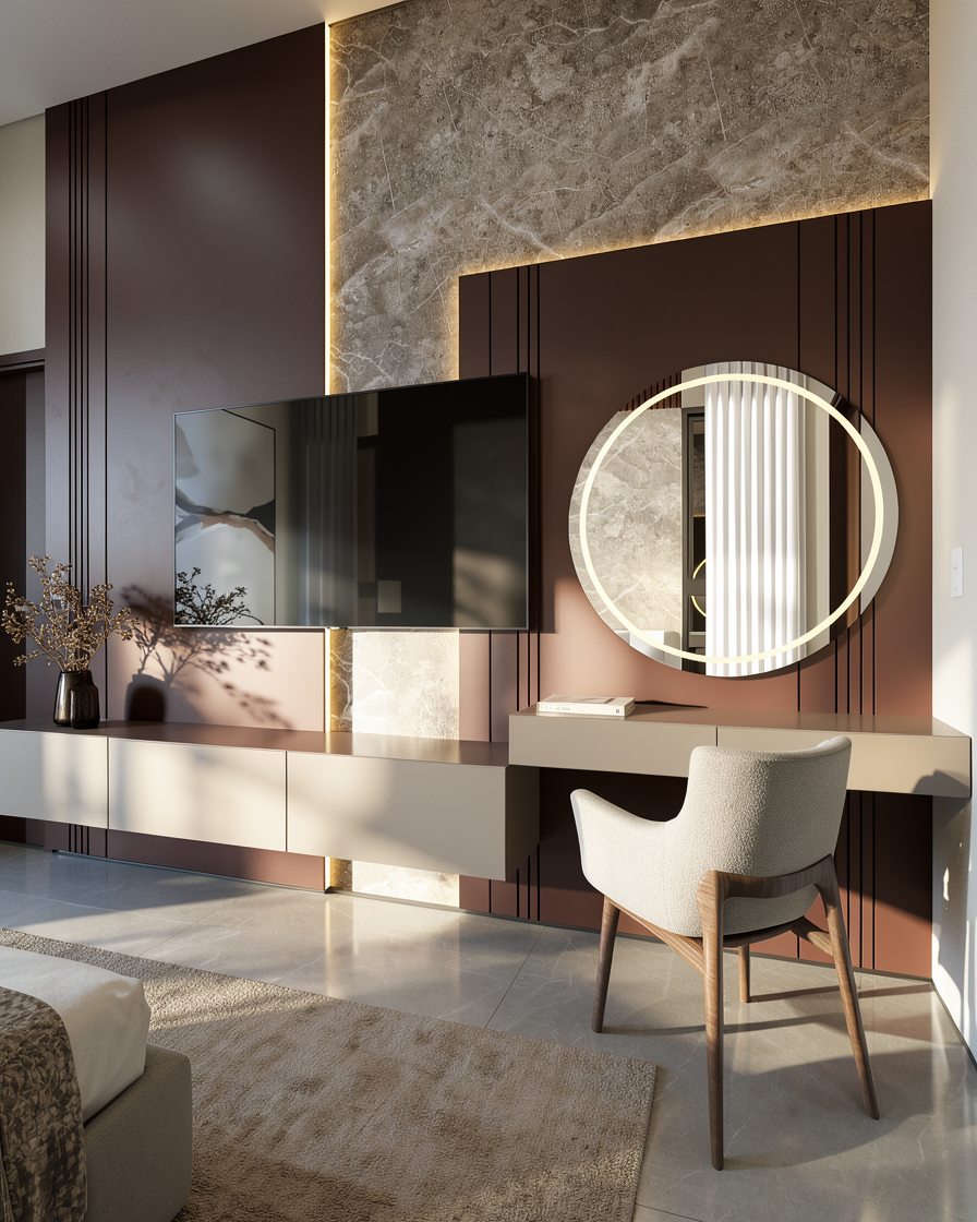 please make the cupboards laminex kalamata open shelf to have book carpet samples green bankers lamp on benchtop with some magazines make the room dark and moody kicker base to be mirrored
