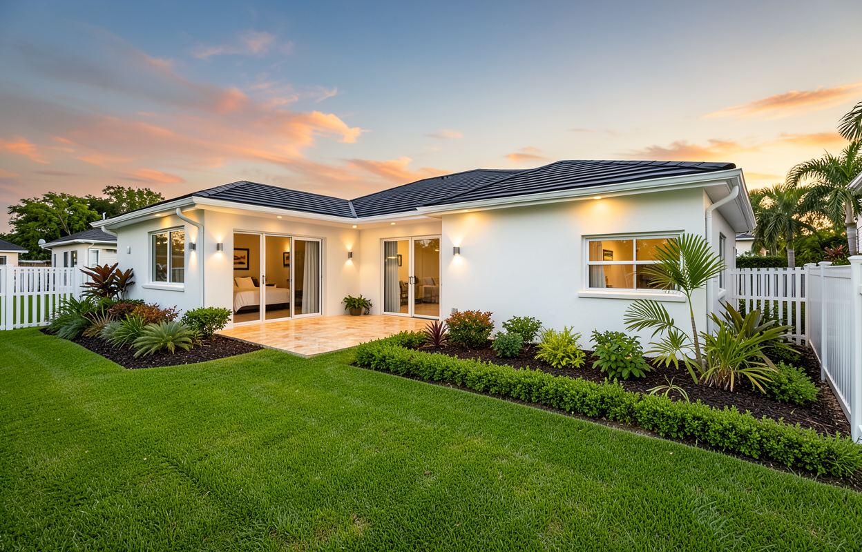 white stucco walls black flat roof tiles travertine patio modern wall mounted lighting soffit lights white aluminum property fence a bed behind glass sliding doors white gutters and downspouts manicured lawn layered florida shrubs and tropical plants with bougainvillea hoa neighborhood context sunset