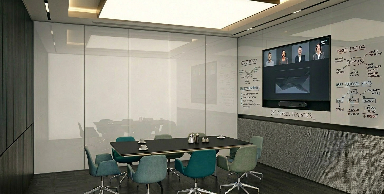 wall panel in the center behind the conference table now to be in a very light grey laminate timber flat panel finish wall to be divided into 5 equal length wise across the wal