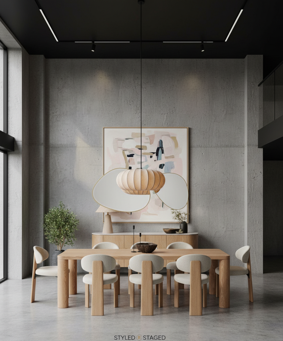 showroom interior with a minimalist artistic atmosphere concrete floor and concrete walls double height ceiling with black finish and linear track lights featuring a large statement artwork generate a front wide angle eye level view remove the word