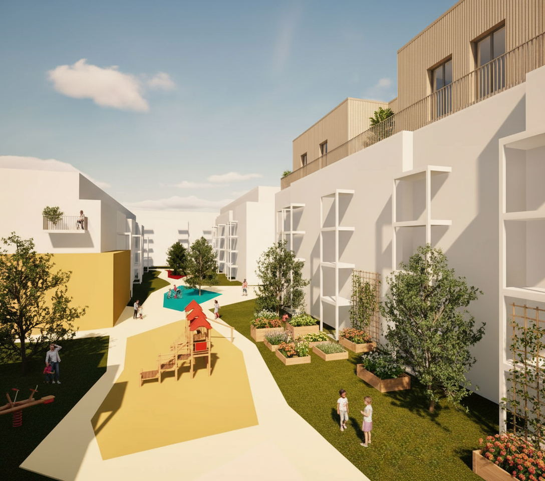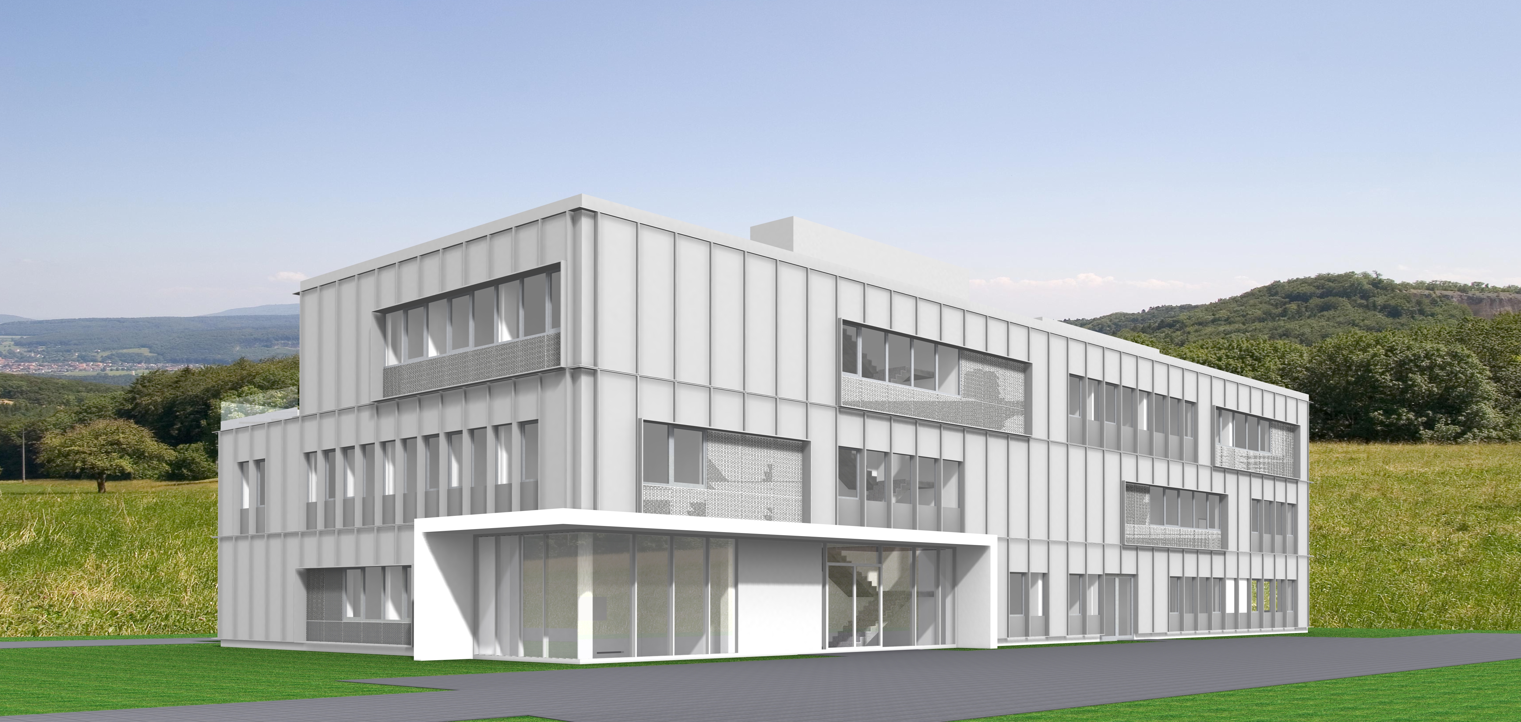 create a photorealistic architectural render of the provided building while preserving the exact geometry proportions facade rhythm openings roof form and camera angle from the source image do not redesign the architecture use an aluminum facade with base color ral 9006 throughout all facade frames must be finished in ral 9006 all window frames must be finished in ral 9006 the rooftop structure roof extension must likewise be finished in ral 9006 only the closed solid infill panels within the facade framing system must be made of perforated metal in ral 9006 matching the look and character of the reference image keep the same panel sizes positions proportions and facade rhythm apply the perforated metal finish only to the closed opaque infill areas inside the facade frames do not change any glazing openings transparent areas or the overall facade composition the canopy must be expressed in exposed concrete the wall below the canopy must also be in exposed concrete the round column underneath the canopy located at the building corner behind the glazing must remain clearly visible through the glass and must also be finished in exposed concrete arrange a small clearly organized parking area in front of the right side facade of the building show only two to three cars in total all cars must be parked exclusively within this parking area and always orthogonally to the facade at a strict 90 degree angle the cars must be aligned neatly in clearly readable parking bays no diagonal parking no parallel parking no random vehicle placement no overlapping cars no distorted vehicles and no cars on grass planting areas or pedestrian paths add only very few people to the scene placed subtly and realistically in plausible pedestrian areas such as near the entrance or along the forecourt the people must remain secondary to the architecture create a friendly and slightly warmer summer atmosphere with a calm elegant and inviting competition style architectural ambiance the overall environment should feel more welcoming pleasant and human centered while remaining refined and realistic in the background show a flat commercial area with low rise warehouse buildings and simple industrial halls understated and secondary to the main building on the left side in front of the building there must be only a green grass area with no street no road and no sidewalk close to the building itself include a few trees and restrained planting to create a greener softer and more welcoming immediate setting keep all planting clearly separated from paved circulation and parking areas use soft neutral summer daylight with diffused light very gentle shadows and balanced exposure minimize direct sunlight on the facade keep reflections very soft and controlled the facade should remain evenly lit clearly readable and free from harsh glare bright specular highlights or strong reflections no morning light no evening light no golden hour no sunset mood and no dramatic sky the final image should be refined realistic professional welcoming and suitable for a high end architectural competition presentation no redesign no changed geometry no changed panel layout no changed facade rhythm no distortion no warped perspective no exaggerated reflections no harsh facade glare no oversaturated colors no clutter no dramatic weather no overcrowded scene and no street or sidewalk on the left side in front of the building