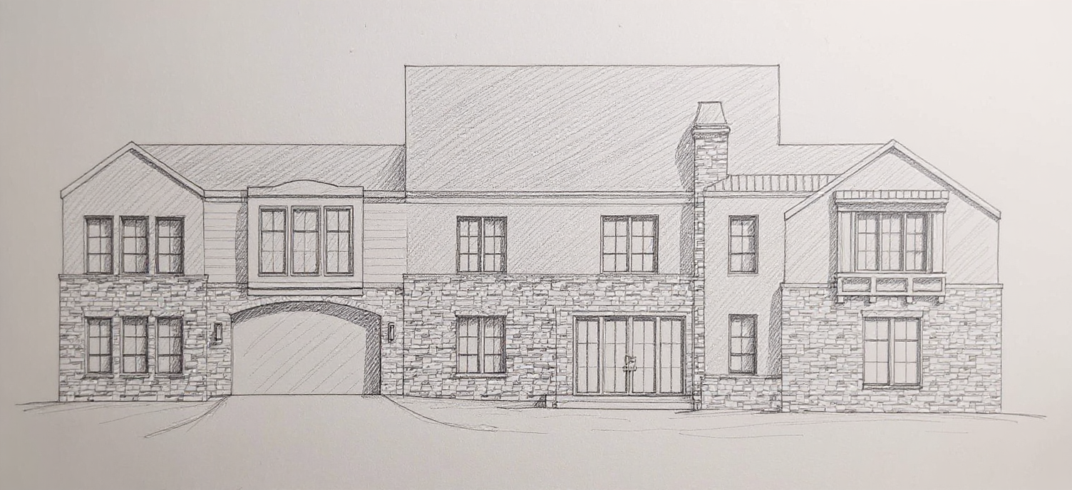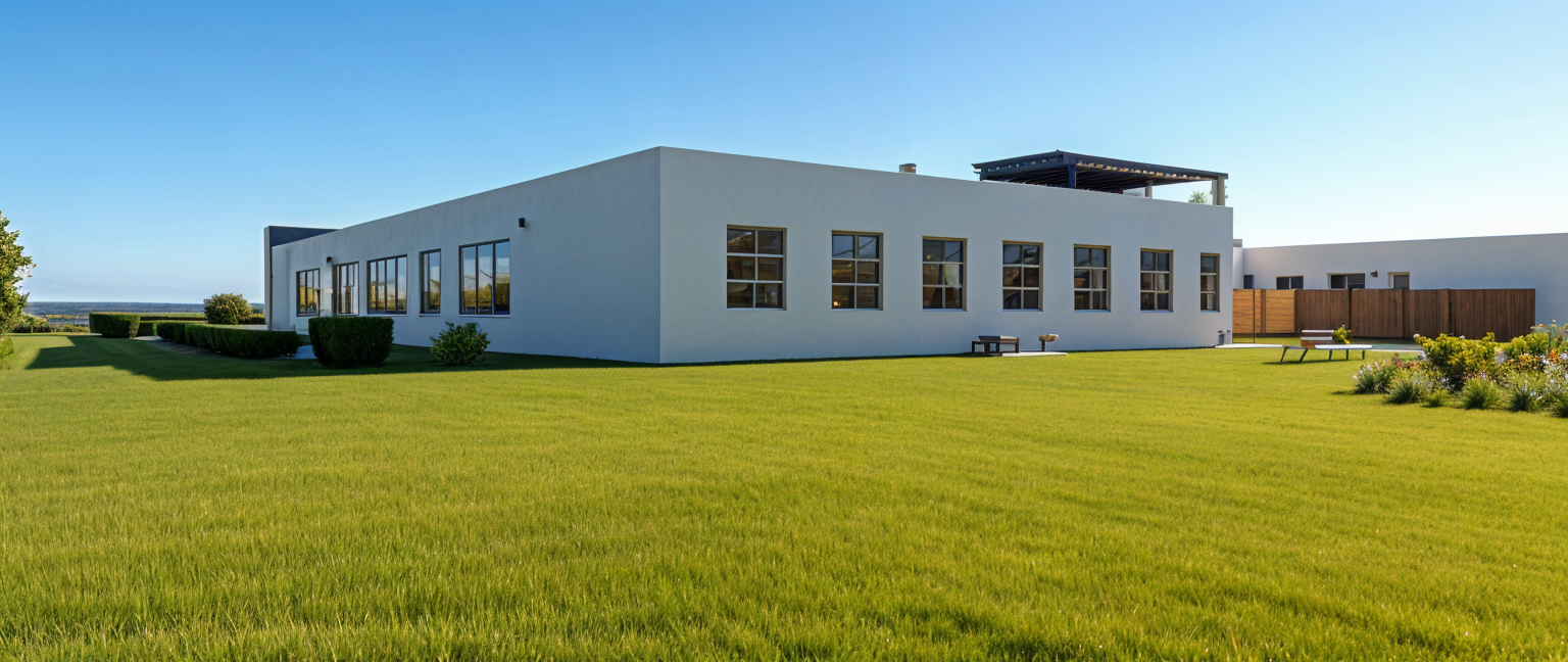 instead of white a school building with windows clear weather lawn with bushes benches flowers