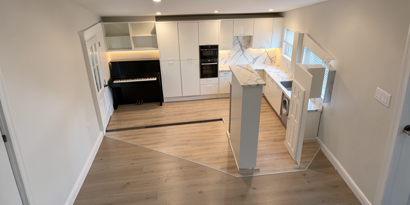 1 remove the person from the scene 2 replace the floor covering with a warm toned oak parquet floor featuring minimal knots and natural variation 3 remove all ceiling lights 4 maintain overall lighting and composition consistent with the original image