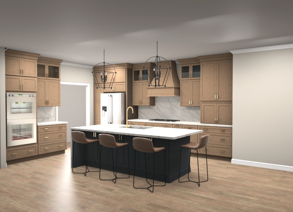 create a realistic photo from this kitchen rendering do not alter the layout the cabinet color is a white oak stain with a gale force island and the countertop is taj mahal transitional style natural lighting magazine look image