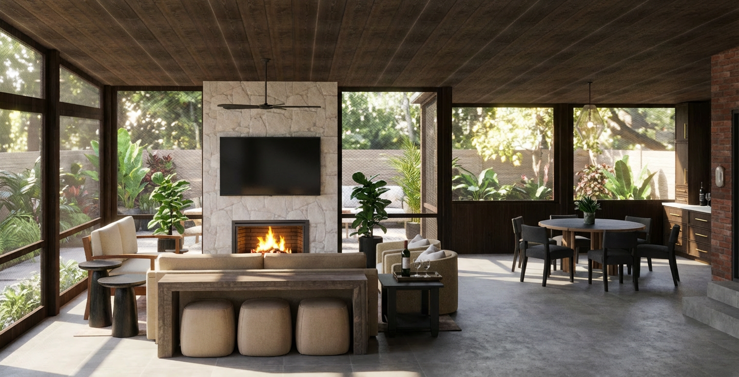 add a backyard scene outside of the screens and render in late morning daylight lighting add brass hardware to the cabinetry remove all reflections as this is a screened in porch there is no window glass only screens