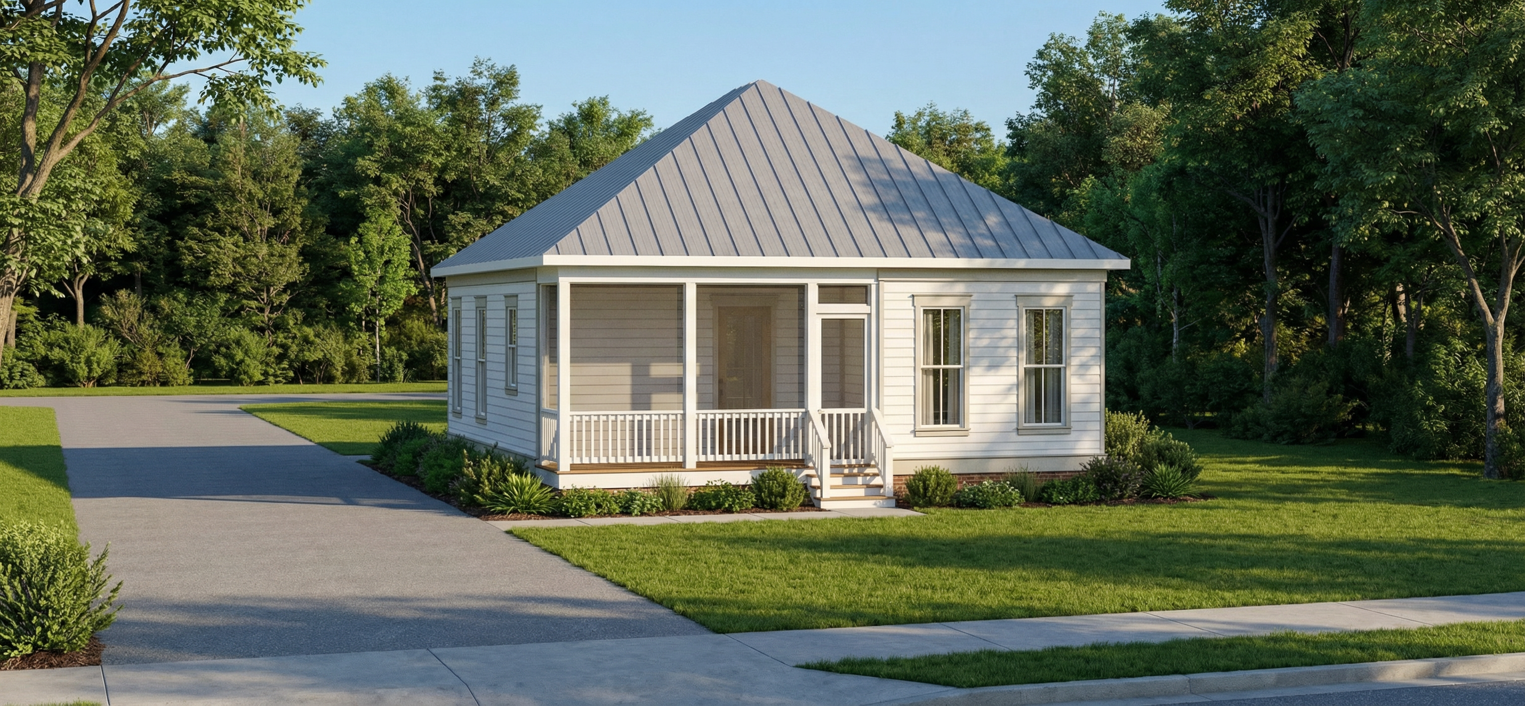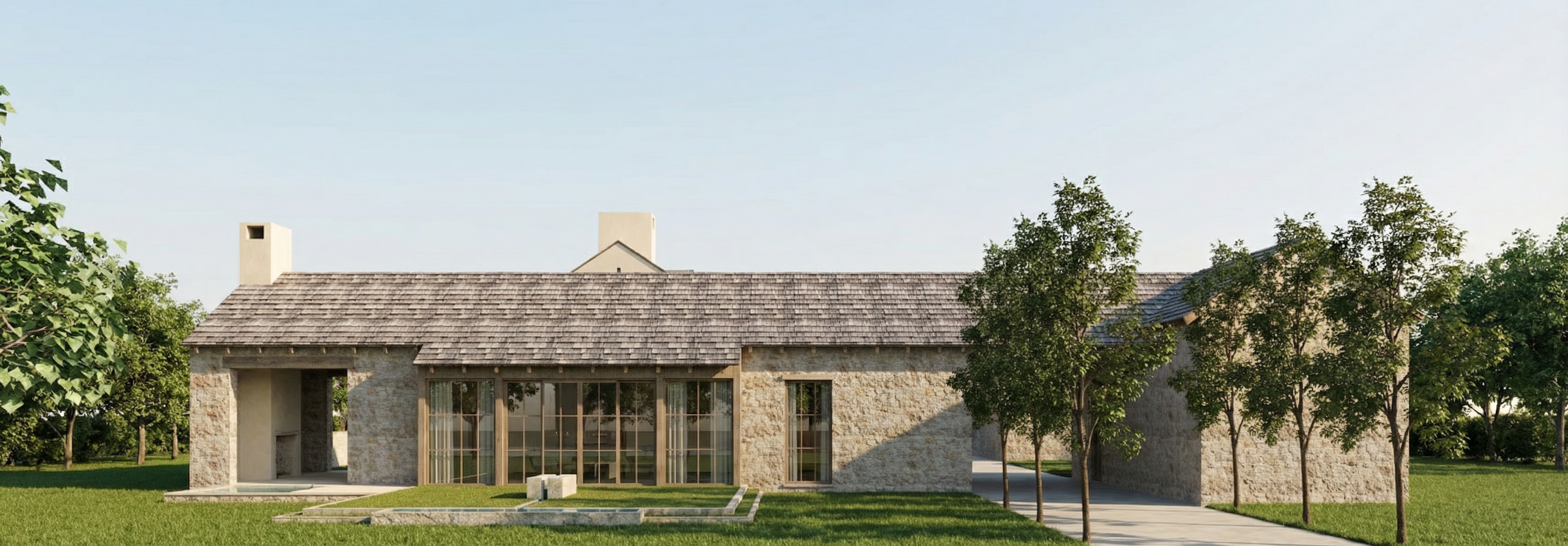 keep the exact same geometry scene content object positions materials textures and camera framing as the original render apply only atmosphere lighting mood and color grading set the scene at dusk sky with thin soft clouds and a cool to warm gradient steel blue overhead transitioning to warm tones near the horizon use cinematic soft lighting with moderate contrast gentle shadows cool ambient fill and warm interior window glow inviting realistic wet ground with realistic reflections on asphalt paving subtle specular highlights very subtle bloom around light sources crisp but natural detail plus a very light atmospheric haze for depth color grade cool shadows cool midtones warm highlights teal in shadows and midtones warm highlights controlled saturation clean neutrals no oversaturation photorealistic architectural marketing render look balanced exposure slightly cool white balance remove the fog make it brighter important desaturate the green 50 keep the sky from the fog render remove the light line from the top of the building make the render softer remove the people add a little contrast remove the car desaturate the image by 30 make it softer