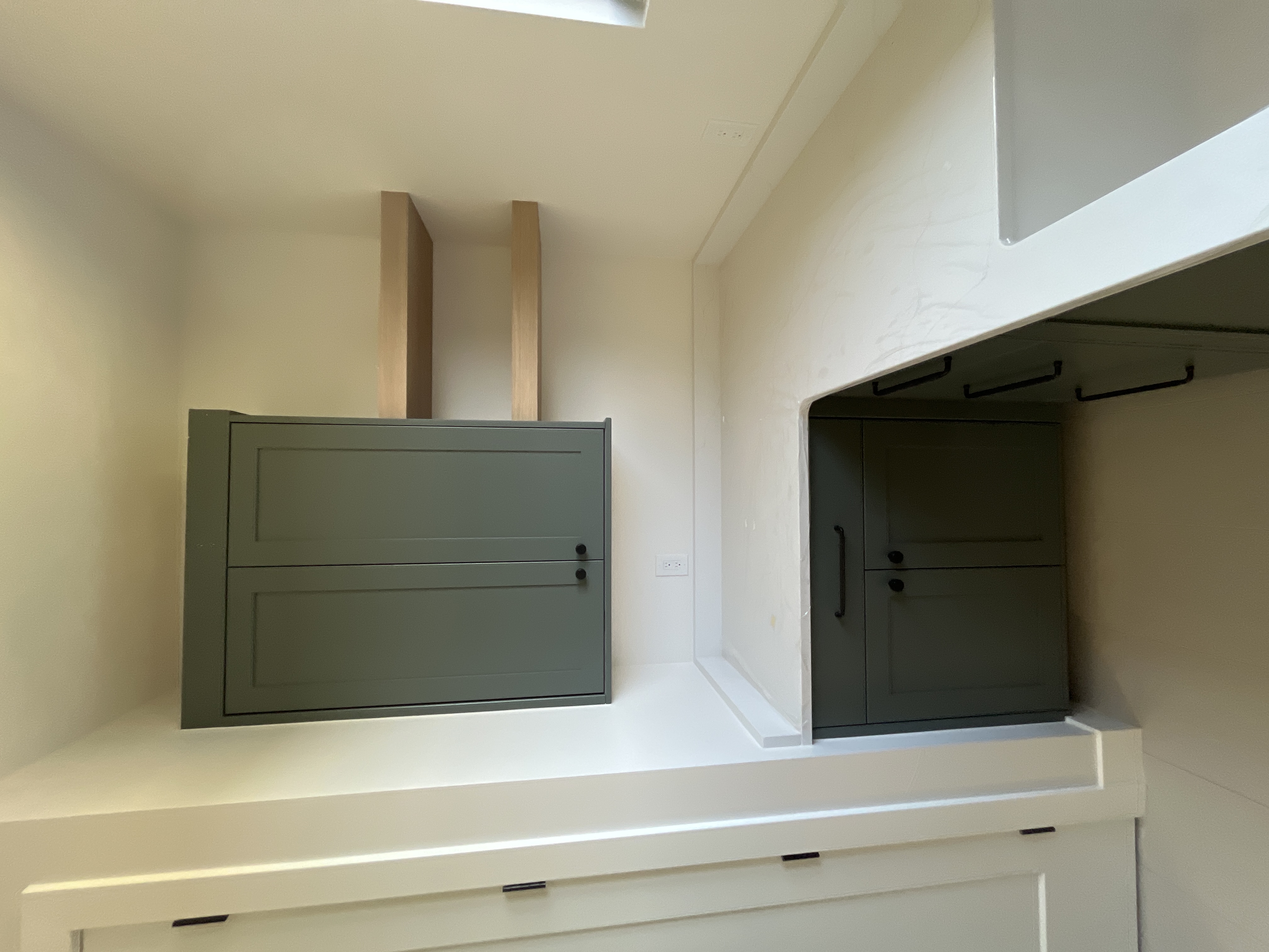 do not change the cabinets in any way preserve the exact cabinet colors materials finishes dimensions door and drawer styles hardware spacing alignment and all geometry exactly as shown do not alter the countertop shape backsplash appliances flooring lighting fixtures or wall structure only remove the construction materials clutter and mess from the scene clean the room and make it look finished and staged add a few simple tasteful home accessories appropriate for the style of the space but do not add or remove any furniture windows or architectural elements maintain the original lighting direction and realism enhance clarity and polish the photo while keeping the cabinetry and room design completely unchanged do not alter the lighting to keep the cabinet colors as they are in the image stage for a laundry room