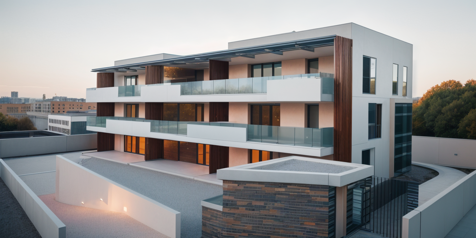 exterior shot photorealistic image of neoclassical villa travertine tile forest background led line lightening