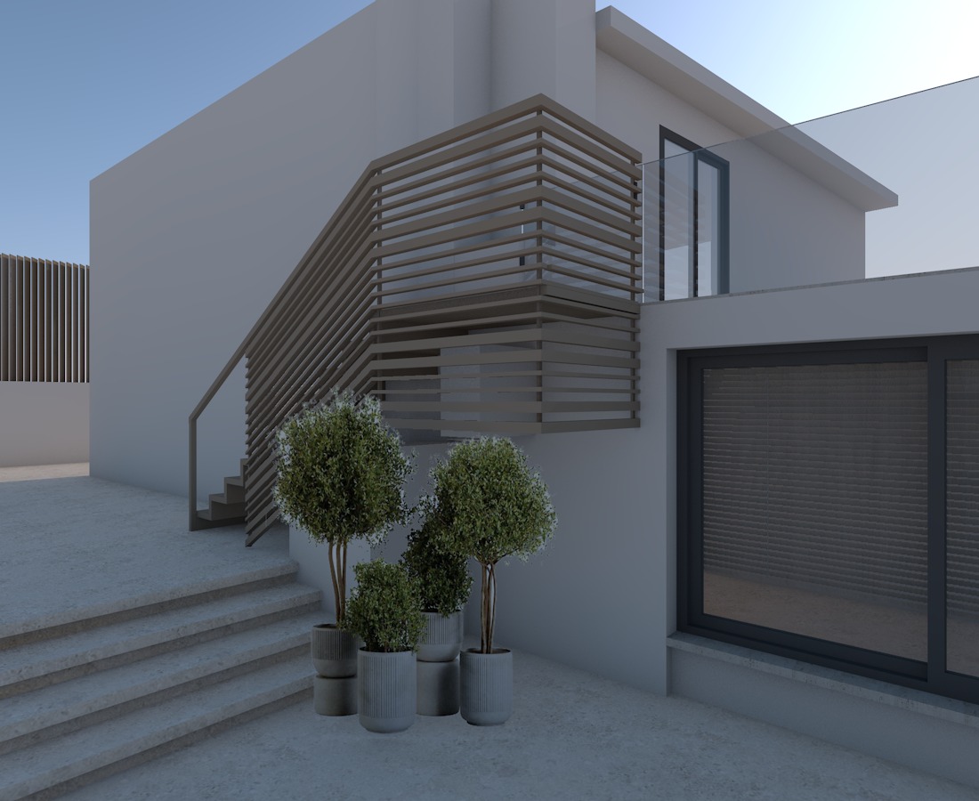 a calm elegant contemporary outdoor courtyard with a minimalist architectural language the scene features a tall central decorative screen made of beige slats creating a refined semi transparent partition and adding rhythm depth and visual lightness to the composition the surrounding walls are smooth warm white plaster keeping the palette soft and understated lighting should be soft and natural like late afternoon daylight with gentle shadows and a calm luxurious mood the final render should look refined realistic and architectural with strong material clarity and a high end design feel grey aluminium glass light beige color at the walls the railing of the stair is also beige nice sky keep the geometry as it is