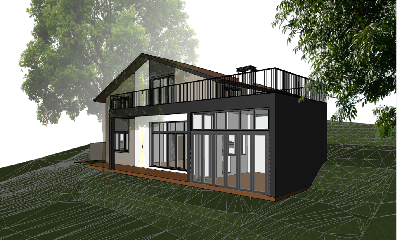 a modern two story house with large windows and a double edged roof surrounded by lush green trees the house exterior is sleek with an anthracite color accented by natural wooden elements and white stucco the windows are reflective and slightly tinted with grey frames the trees are vibrant green casting soft shadows on the structure the atmosphere is serene and peaceful with a bright clear sky enhancing the natural beauty of the surroundings the ground is covered with rich green grass subtly sloping to the side the setting is tranquil and inviting perfect for a modern architectural paradise