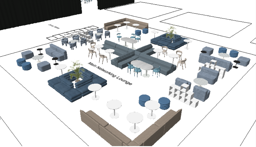 tables white centre lounges a little bit more light blue carpet in dark blue delete text corner lounge tan colour add people some small library lamps on only some tables add items like plants books lamps on storage white items remove lines on floor and add context of some food station from icc sydney blue furniture around in cocktail style high tables stools longe white tables with chairs