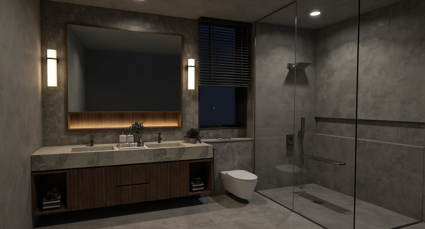 door bubble glass mirror reflects shower no tiles only seamless surfaces no round in shower add towels on cabinet