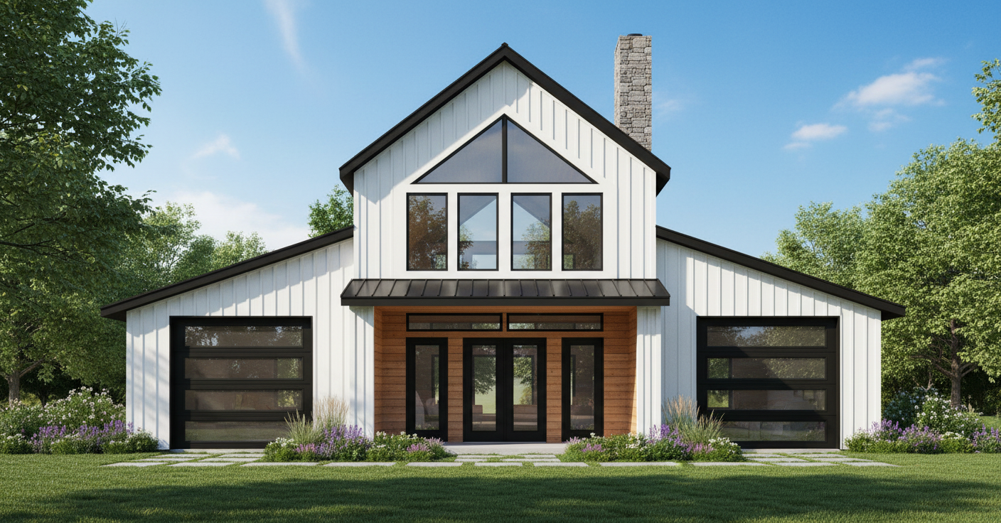 board and battin white black windows black roof black garage doors monitor style barn garages in lean toos take out gables on sides inset from doors and windows for 2 story covered patio make covered patio deeper wood on inside of covered patio keep shed roof on sides 2 story front entrance remove roof line behind front of house inset 2 story covered patio more extend covered patio up to second story roof
