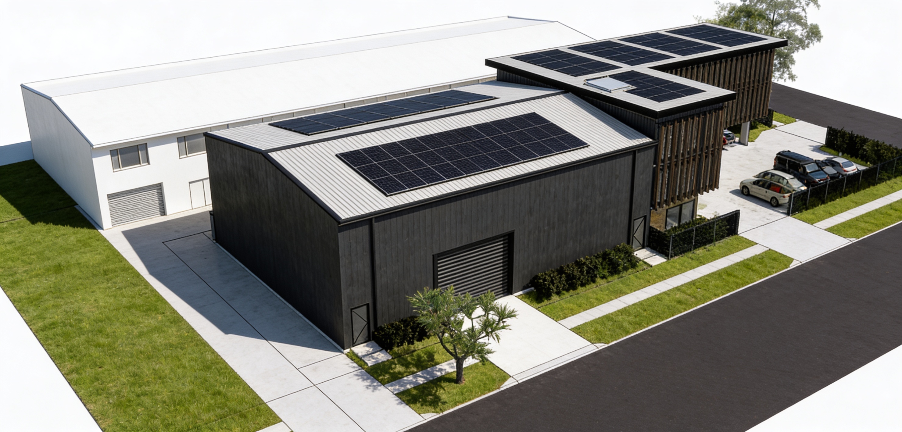 modern exterior shot render the image of a two story house with a wooden exterior and a gabled roof use warm earthy tones like rich browns and rustic reds for the wood siding the roof should be covered with light gray shingles the central stone section should be depicted with a mix of soft grays and sandy yellows highlighting the texture of the stone the windows should have sleek black frames reflecting a clear blue sky surround the structure with lush green foliage creating a serene and inviting atmosphere the overall feel should be warm welcoming and harmoniously integrated with nature architecture