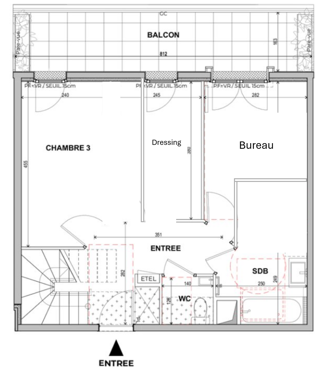 convert this floor plan into a realistic isometric 3d view of a full house show the space from an elevated angle with furniture walls and details visible the floor must be waxed concrete the sdb bathroom must have italian shower and bathtube and double sink dressing must have closets against the walls and the bureau is a working office with computer the floor for the sdb and toilet are ceramic porcelain stoneware beige there is a washing mashing in the toilet use the same furniture as shows on the plan do not change the orientation of the floorplan