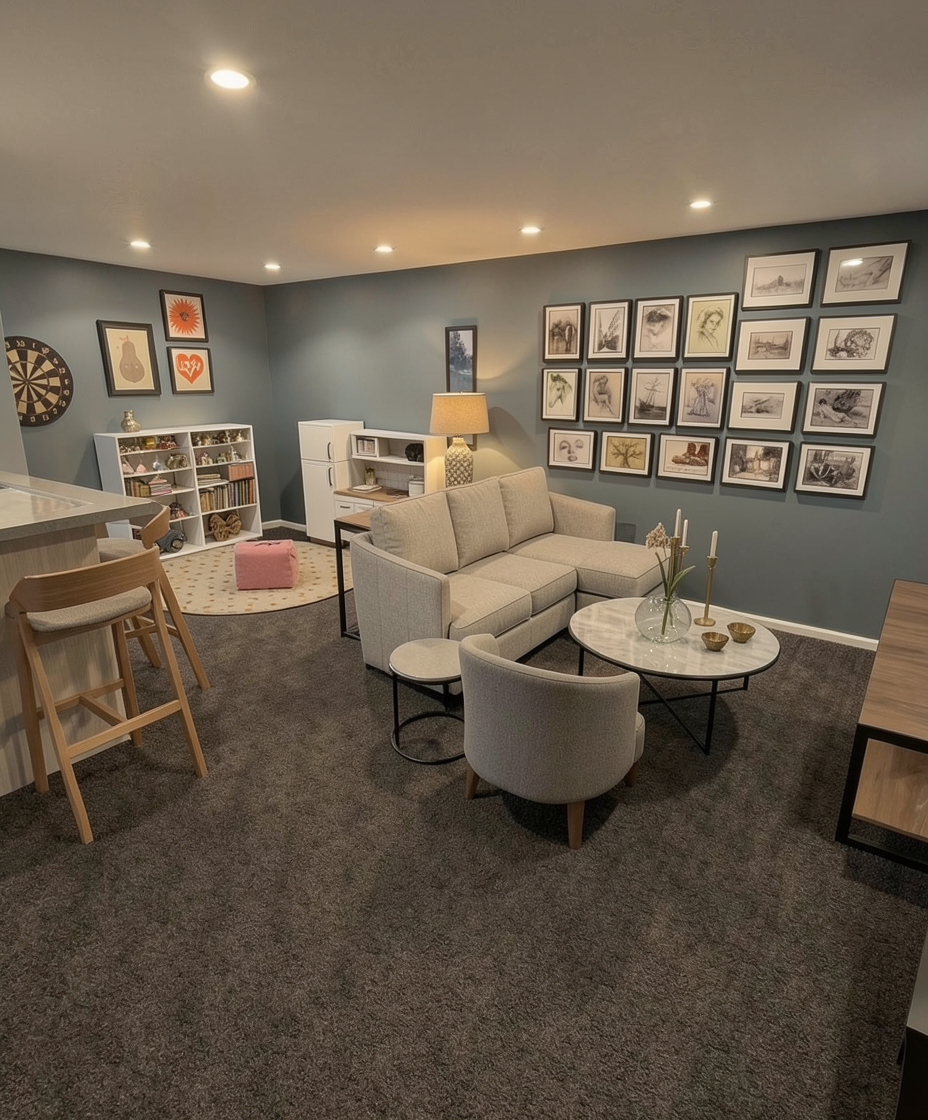 create a photorealistic rendering of my 3d sketchup model of this finished basement add recessed lighting on ceiling