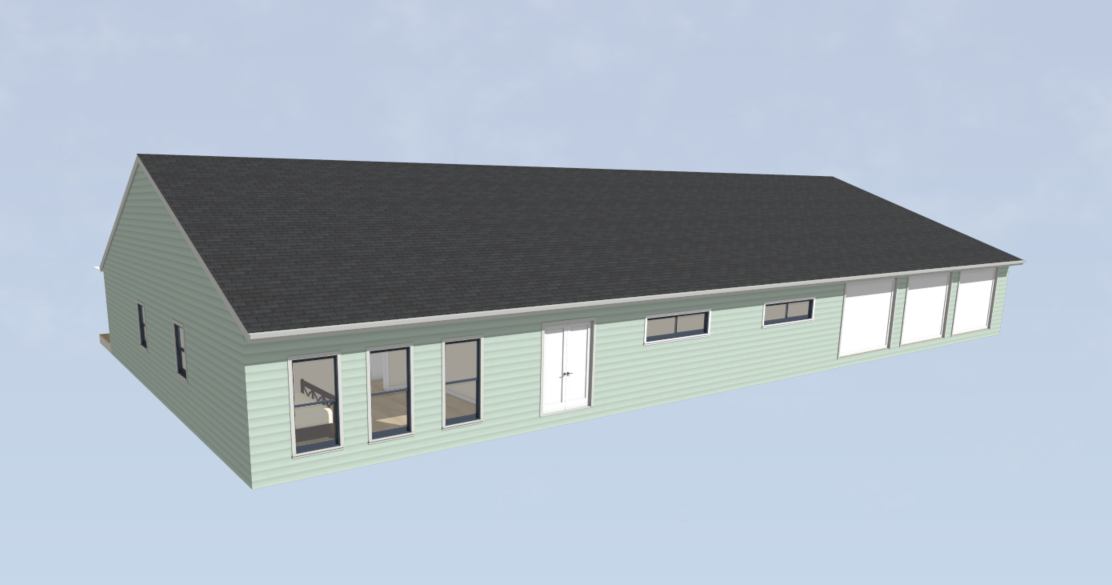 modernist exterior shot modern barn style shed home with a strong gable roof form clad entirely in monument colour metal cladding deep charcoal black matte finish minimalist architectural design with clean sharp lines and no decorative detailing feature a large symmetrical front fa ade with a central oversized light natural timber entry door plain no panels framed by full height black framed glass windows include exposed timber posts and simple beam structure at the entry using warm natural timber to contrast the dark cladding roof and walls seamlessly clad in the same monument metal creating a monolithic form no gutters visible hidden drainage clean edges lighting soft golden hour light hitting the dark fa ade creating contrast and shadows architecture