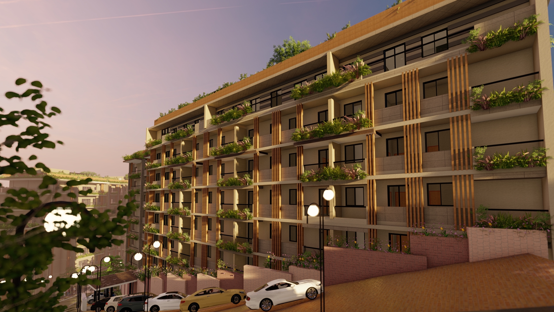 sunset lighting modern contemporary materials in warm gray tones improve plants with more variation of pines and forest trees wood slats in the facade cinematic photorealistic 4k resolution 16mm camera lens