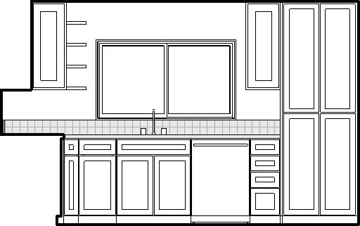 kitchen cabinet elevation with dark blue lower cabinets white upper cabinets light gray backsplash clear glass window above sink stainless steel plumbing fixtures architecture