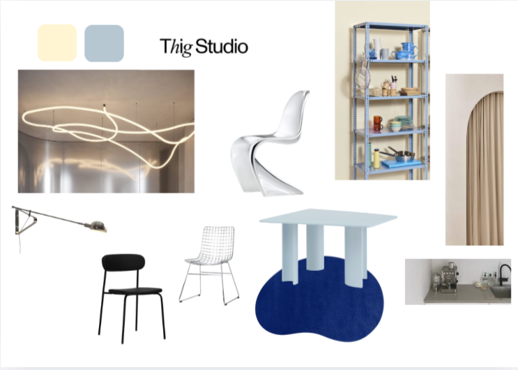 exterior shot combine the reference image and the moodboard keeping the exact geometry and layout of the original design the table should be finished in a light blue tone as shown in the moodboard maintain the color palette with soft butter cream and warm yellow tones combined with the wooden floor ensure five chairs are placed around the table using a mix of the three chair types provided in the moodboard keep all architectural elements unchanged especially the curved kitchen geometry and layout at the right edge of the kitchen include a curtain in a soft buttercream light yellow tone this curtain is an important design element and should clearly frame the space use warm natural daylight entering the space creating a soft inviting atmosphere materials should feel high end and realistic with a subtle contrast between cool metal surfaces and warm tones the overall result should be a refined luxurious interior rendering with a calm and balanced composition