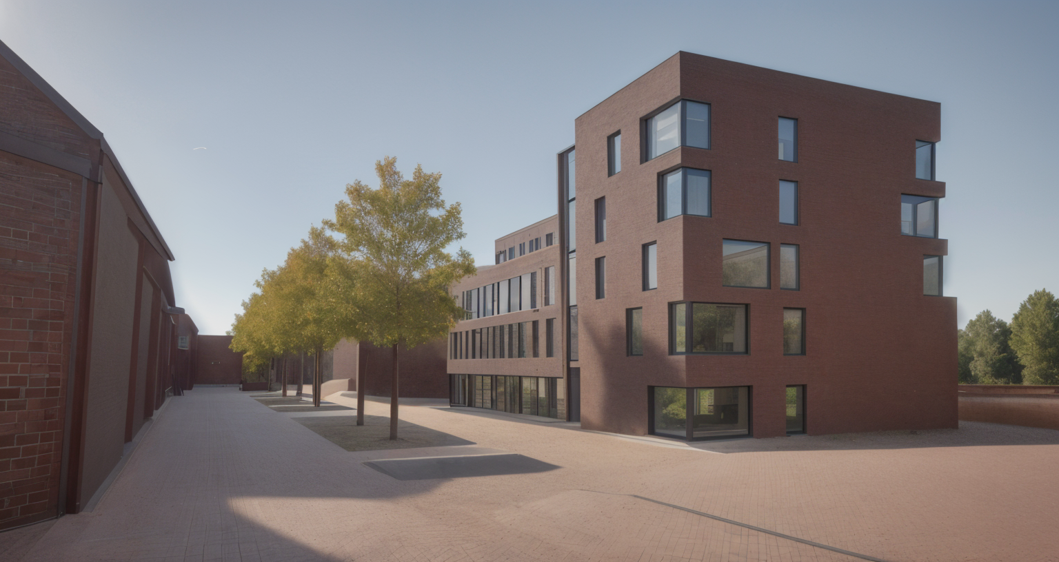 please use a dark red brick facade the rear part of the building in gray plaster and please leave the surrounding area gray it should be a summer day the sun should shine and the road should be paved architecture