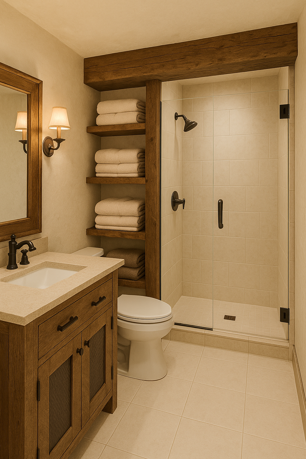 create a rustic bathroom that is 6 feet 4 inches wide by 15 feet long on the short wall is a shower that is 3 feet 7 wide and beside the shower is a rustic cabinet the toilet is next to the shower spaced 2 feet away and next to the toilet is a 6 foot double vanity in rustic alderwood architecture