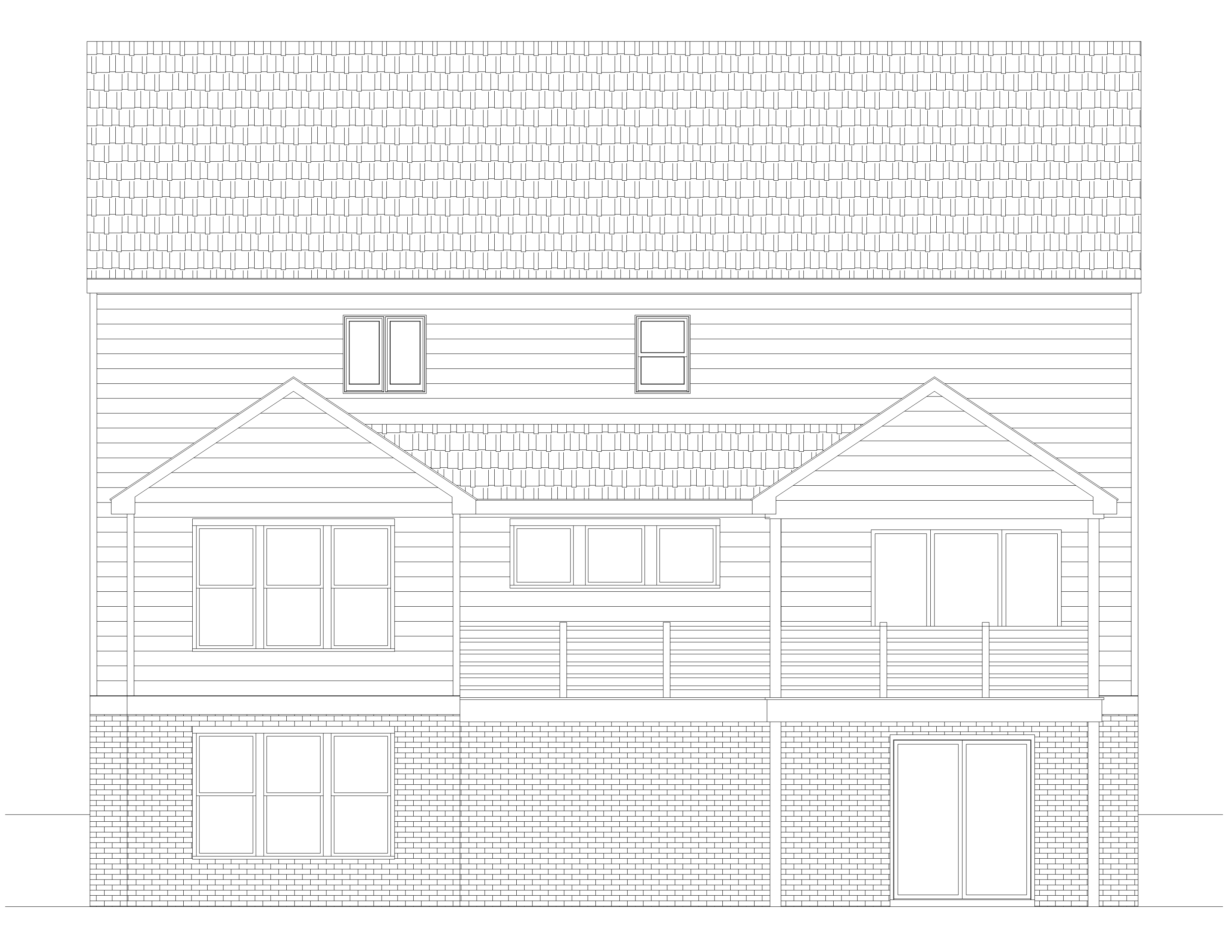 generate a beautiful rear elevation rendering of a two story house with a basement with a warm and inviting atmosphere the house features a modern design with a gable roof use soft pastel colors for the walls such as a gentle sage green and white trim for the edges and corners the roof should have a light grey tone with subtle shading to show depth the windows should have white frames and light reflecting glass set the scene during a serene golden hour with a partly cloudy sky casting a peaceful warm light across the house include a well maintained garden in front with lush green grass and colorful flowers like lavender and daisies to enhance the tranquil atmosphere the bottom level is brick veneer