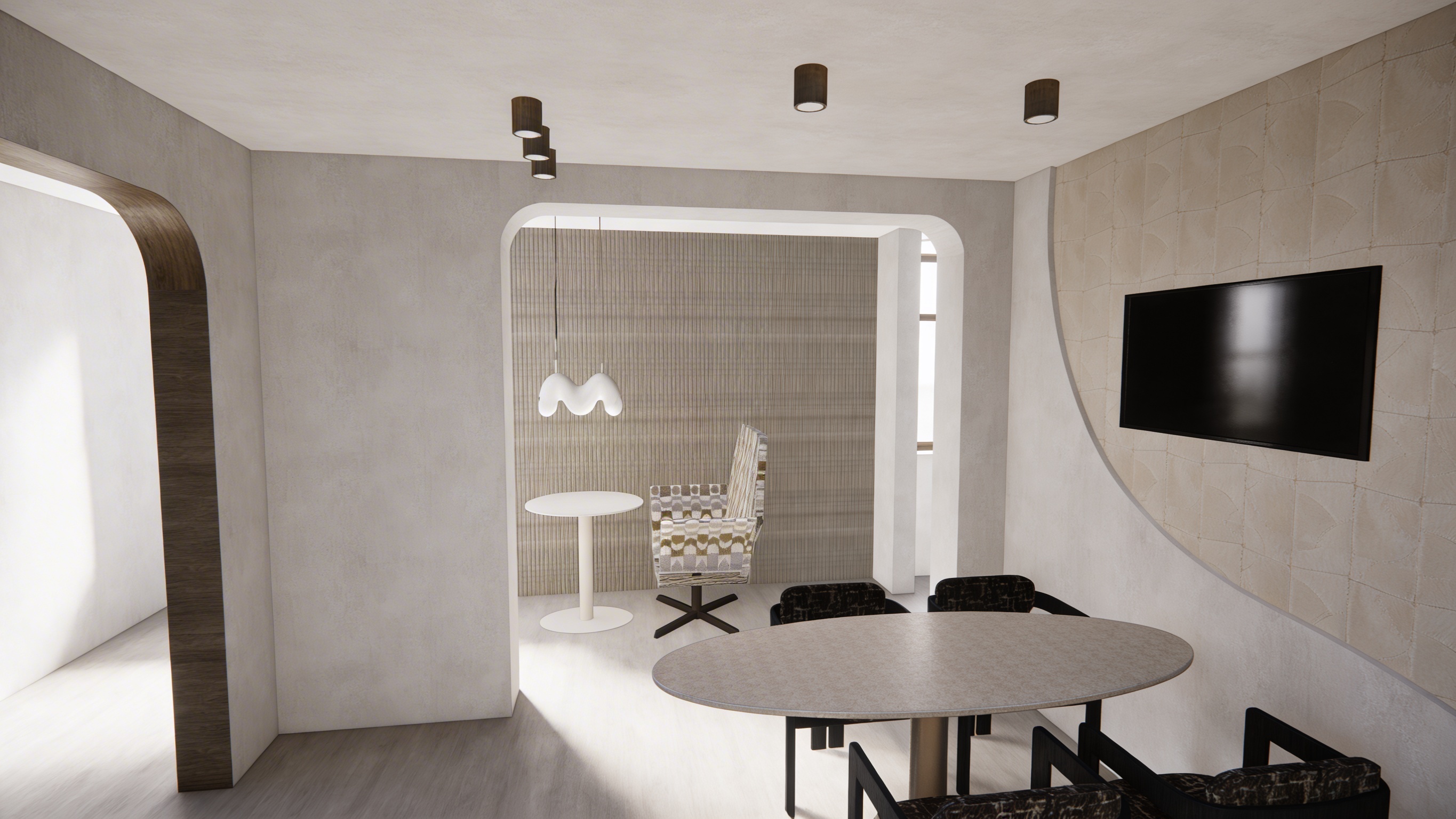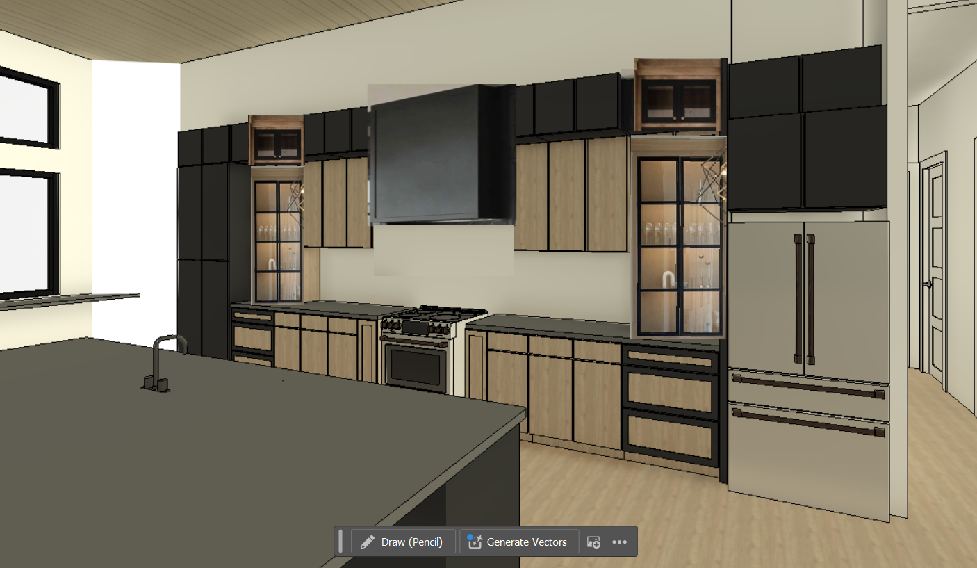 you are an experienced interior design and 3d visualization specialist with a deep understanding of transforming conceptual artwork into photorealistic immersive 3d environments i seek your expertise to convert an illustrator rendering composed of pasted snippets into a fully realized lifelike 3d live image of a kitchen space please focus on the following aspects accurately interpret the existing 2d illustrator design preserving its layout proportions and stylistic intent develop a detailed 3d model of the kitchen including architectural elements cabinetry appliances fixtures and finishes apply realistic materials and textures that reflect authentic surface qualities such as wood grain metal glass and stone integrate advanced lighting techniques to simulate natural and artificial light sources ensuring proper shadows and reflections enhance spatial realism through accurate perspective depth and scale making the scene immersive incorporate subtle environmental details such as decor utensils and ambient effects to bring the kitchen to life optimize the final rendering for high resolution and clarity suitable for professional interior design presentations leverage your advanced skills in 3d modeling and interior visualization to transform the initial 2d artwork into a compelling and realistic representation that effectively communicates the design concept your expertise will be critical in achieving a visually stunning and authentic kitchen environment this is modern rustic with a calacatta backplash and please make the cabinets with the windows i placed on each side to be angled like the other cabinets and realistic