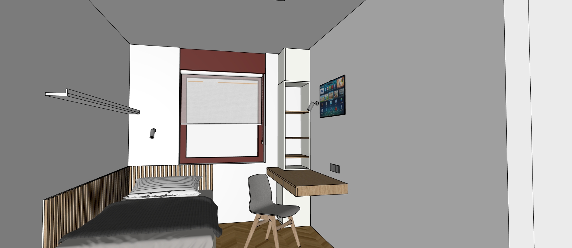 keep same interior design same materials and colors same furniture and lighting put some books on the shelves put some book on the shallow shelf above the bed keep all walls and ceiling white