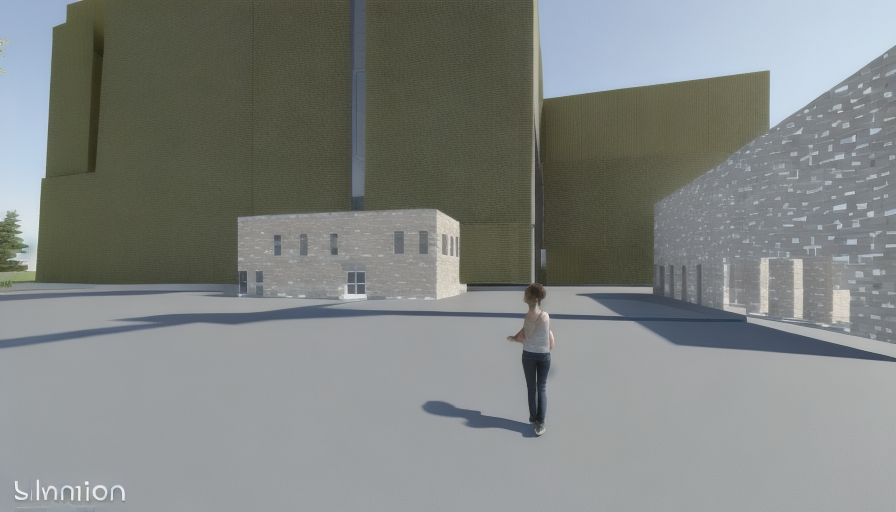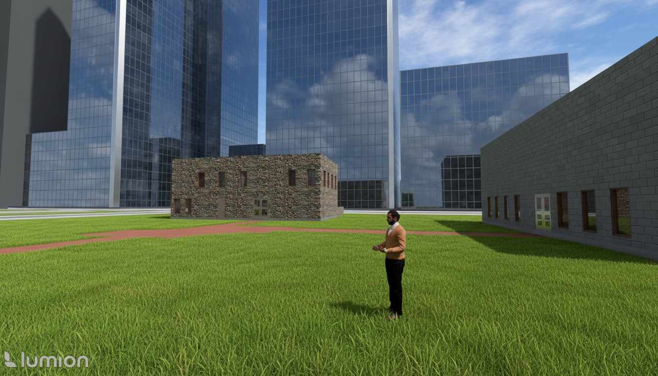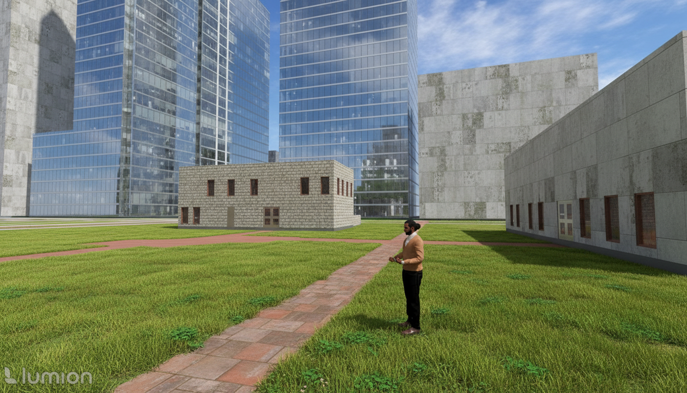 render this image exactly as shown keeping the same geometry form proportions camera angle layout and composition do not change or move any elements only enhance the scene by adding simple realistic landscape such as modest trees and plants do not add any extra objects or dramatic features maintain the existing background buildings and integrate them naturally upgrade materials and landscape only no geometric or compositional changes
