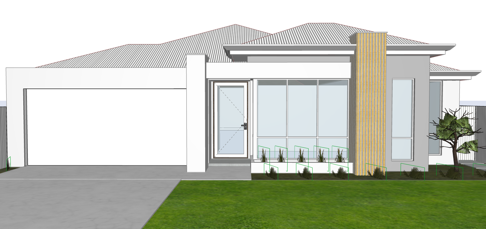 render a modern single story house with a sleek contemporary design the exterior walls are bright white contrasted with sections of light gray emphasize the tall narrow vertical feature in a warm honey wood tone the roof is a light silver gray providing a modern touch large windows are present showcasing transparency and inviting natural light with a soft blue tint the driveway is a smooth light gray concrete surrounding the house is a vibrant green lawn adding freshness to the scene include a neatly trimmed hedge in a darker green along the facade the atmosphere is bright and sunny with a clear blue sky creating a welcoming and serene ambiance
