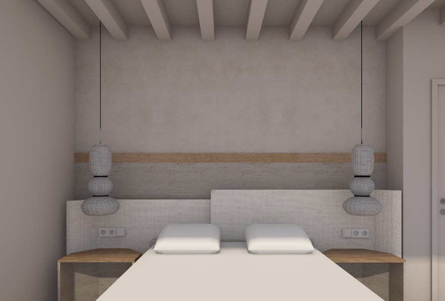 create a high end photorealistic render of a bright luxurious bedroom with a refined and expensive feel the materials should feel authentic with realistic texture the flooring is matte with a polished cement look in a sand off white shade cohesive and elegant the lighting should be warm natural and balanced maintaining a bright atmosphere add beautifully arranged high quality bed linens with soft folds and a soft aesthetic the overall mood should feel contemporary sophisticated bright and editorial as if photographed for a luxury interior design magazine keep the initial materials like cotton linen travertino light oak wood the pendant lights avove the nightstands have fabric like surface has fine pleats head bed linen sand texture