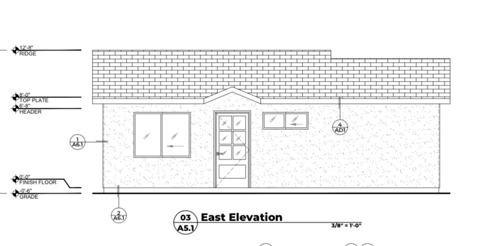 render this adu in a photorealistic image with smooth stucco siding on the gables composite shingle roof and raw wood tone posts nice landscape with a walk way leading to the front door
