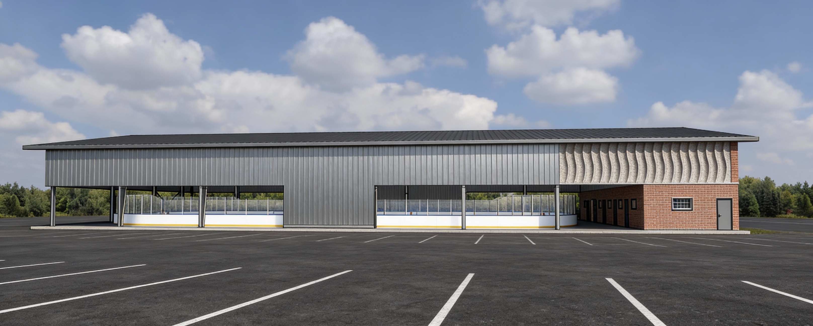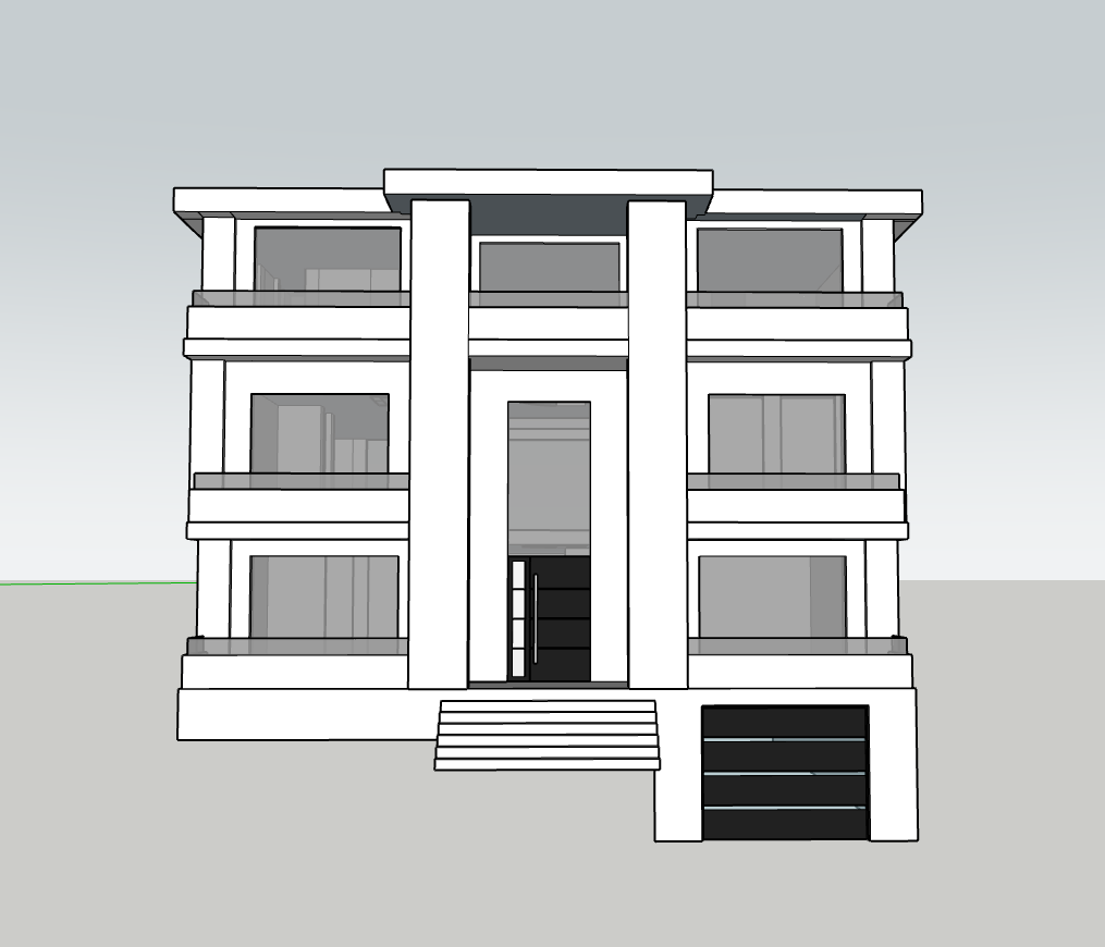 please make a realistic render with warm modern tones and black window frames set in a residential neighborhood with some large mature trees in the background material showing natural limestone and stucco show contemporary accents make the current dark grey glass panels into sliding glass doors make the windows on the top arched and have the roof curve around it also make the window above the door have an archtop make the roof dark slate