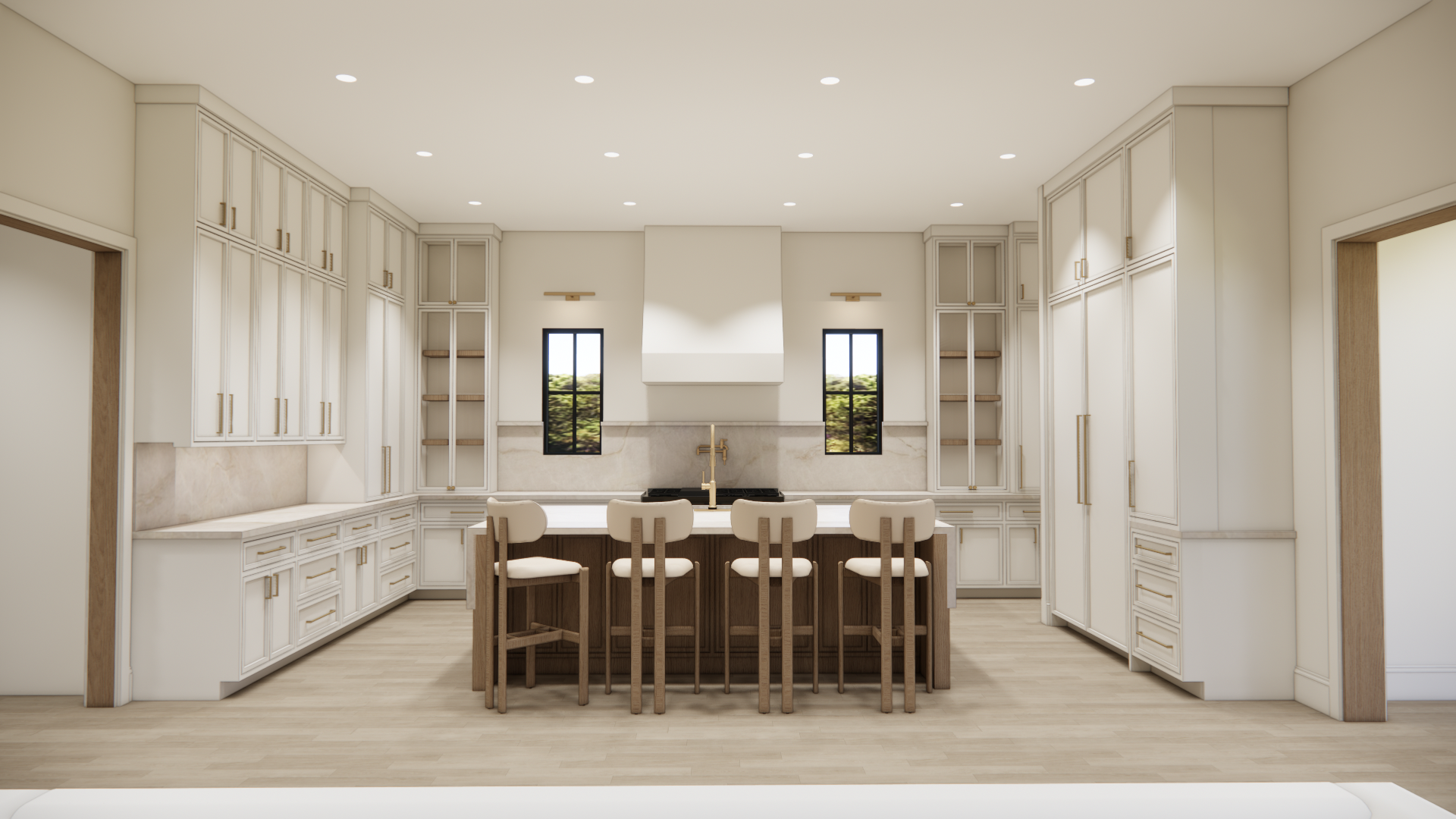 convert this architectural rendering into a highly realistic editorial style luxury real estate photograph suitable for marketing and listing imagery maintain the exact architecture layout geometry cabinetry layout window placement and proportions exactly as modeled do not redesign restyle or modify the architecture or cabinetry do not move or adjust cabinets appliances islands windows or walls enhance realism only through natural lighting accurate material texture subtle reflections and soft shadow depth the image should feel like a professionally photographed architectural digest style interior used for luxury real estate marketing materials in the space include builddirect engineered wide plank flooring in seashore finish walls and ceiling painted origami white by sherwin williams cabinetry featuring a combination of white painted cabinets and natural stained wood cabinets countertops and backsplash in taj mahal quartzite with soft slightly warm tones the wood flooring should show authentic grain correct plank scale subtle tonal variation and a natural matte sheen the natural stained wood cabinetry should show realistic wood grain depth natural variation and refined craftsmanship white cabinetry should appear clean crisp and softly illuminated with natural shadow lines at the doors and panel details the taj mahal quartzite counters and backsplash should appear natural and refined with soft movement and subtle warm tonal variation not overly glossy or artificial natural light should be softly entering through the windows in an editorial architectural photography style creating gentle highlights natural interior bounce light and subtle shadow depth throughout the space the furniture and decor shown in the rendering should be treated as placeholders and replaced with high end restoration hardware and pottery barn style staging elements appropriate for a luxury kitchen inside the glass upper cabinets add very minimal restoration hardware style styling only a few carefully placed objects should be visible such as a small stack of neutral ceramic plates a few simple glassware pieces one refined serving object the glass cabinets should remain mostly open and uncluttered maintaining a clean high end appearance add subtle kitchen staging elements such as a neutral stone or ceramic bowl a refined serving tray or board a small stack of curated cookbooks all staging should remain restrained and minimal so the architecture and cabinetry remain the focus the final image should appear highly realistic refined and editorial similar to a luxury architectural digest feature or professionally photographed high end listing do not alter architecture cabinetry layout appliances materials geometry or design only enhance realism and staging