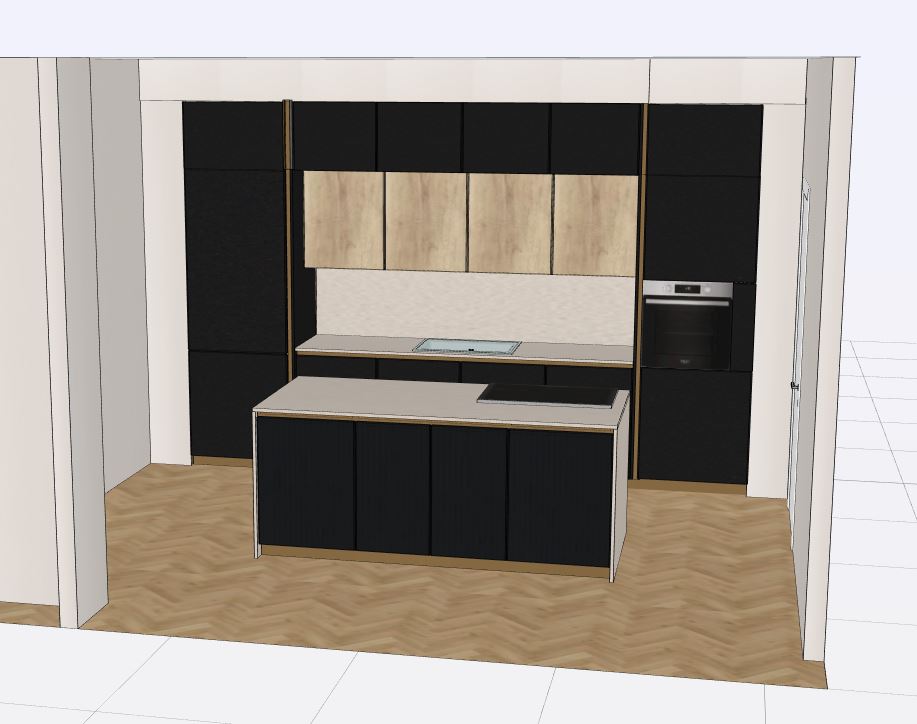 create a modern kitchen interior with minimalist design use matte black for the cabinetry and a light wood texture for the upper cabinet doors the countertop should be a sleek light gray marble design the floor with a warm natural wood herringbone pattern incorporate stainless steel appliances and have soft diffused lighting that creates a calm inviting atmosphere use light gray for the walls to complete the elegant look