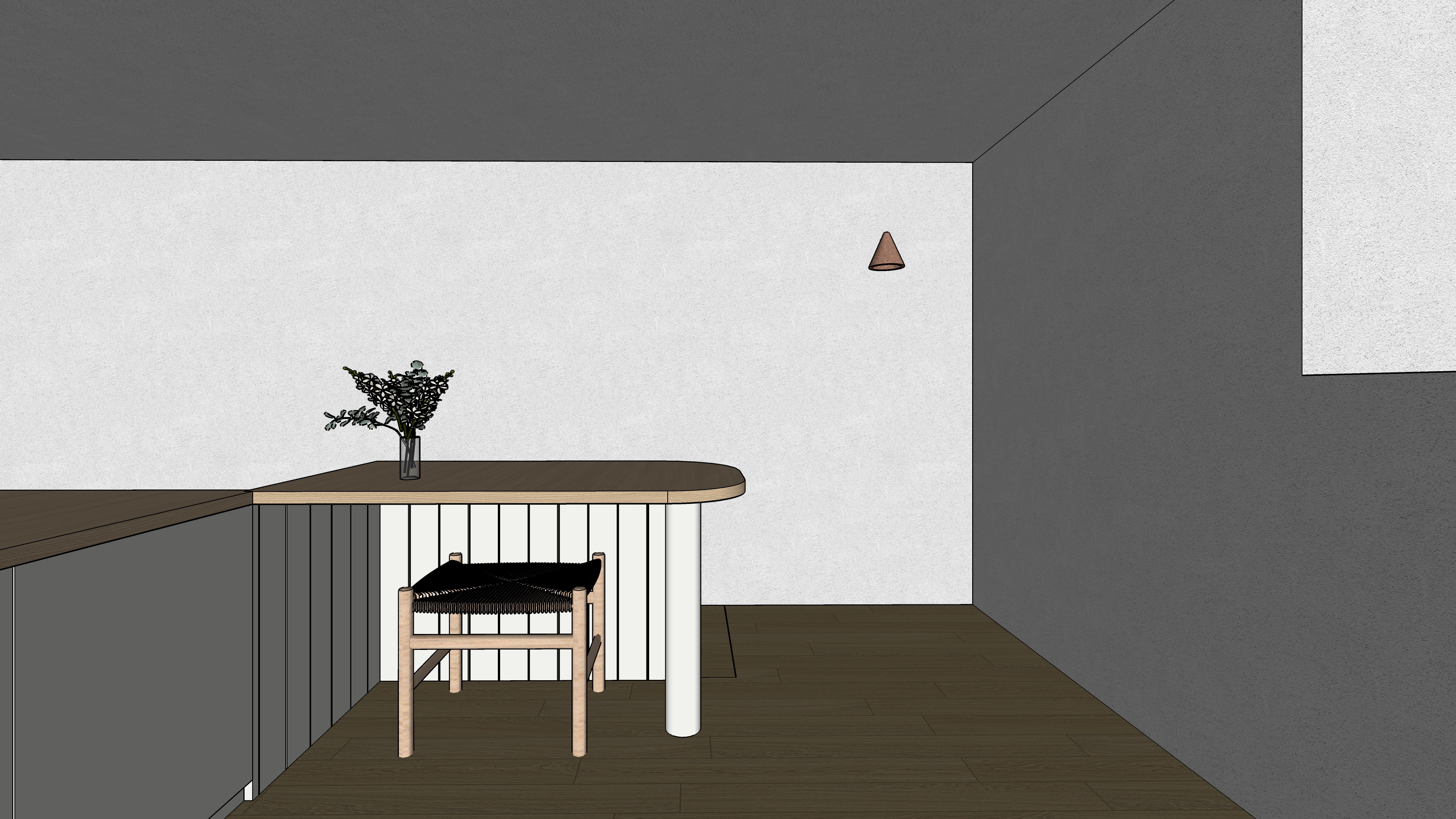 main prompt this is a cycladic house in kythnos we are in the mezzanine the floor is oak wood the base cupboards are white the desk is oak wood the walls are white there is natural light the sconce is terracotta ceramic the stool is natural rattan color the window frame is sage green negative prompt do not change geometry do not add objects do no change colors or materials