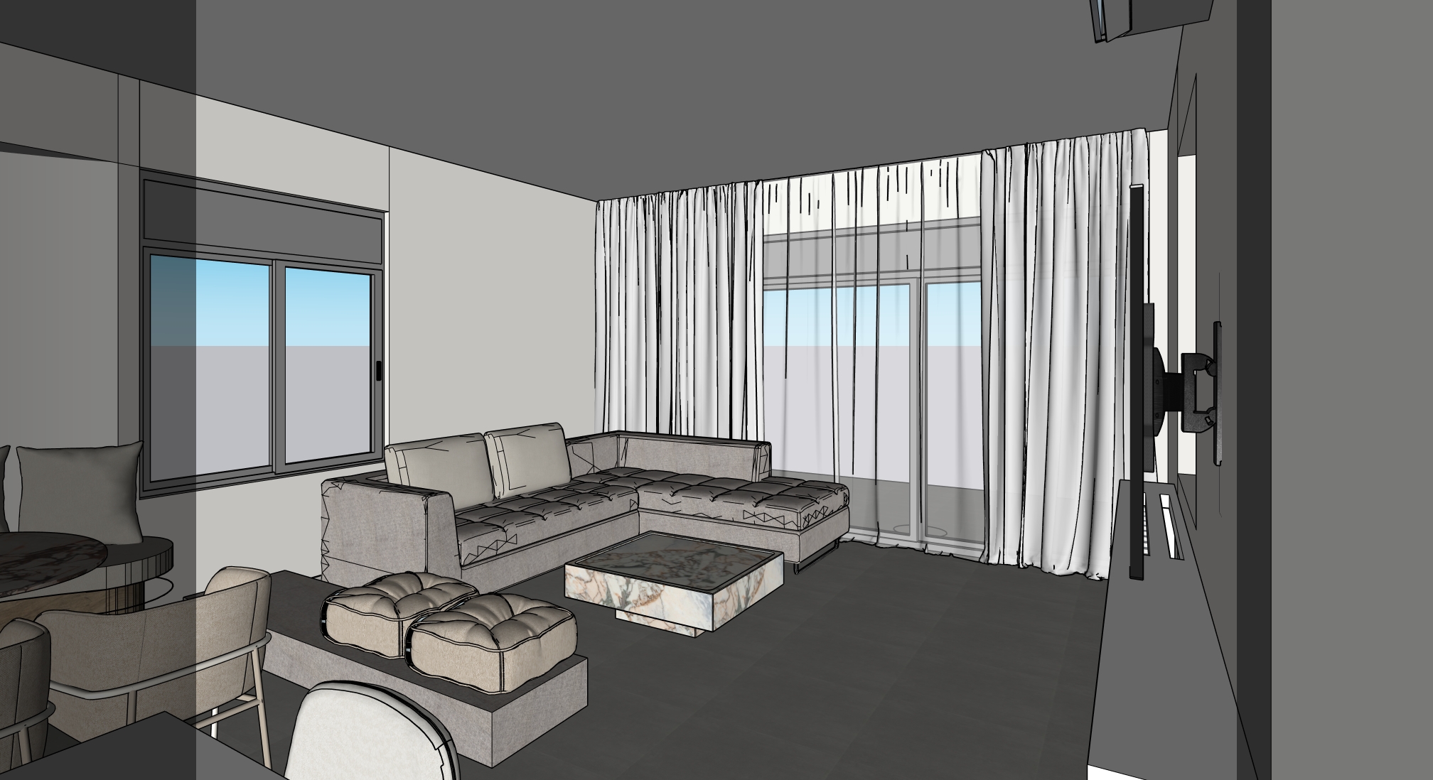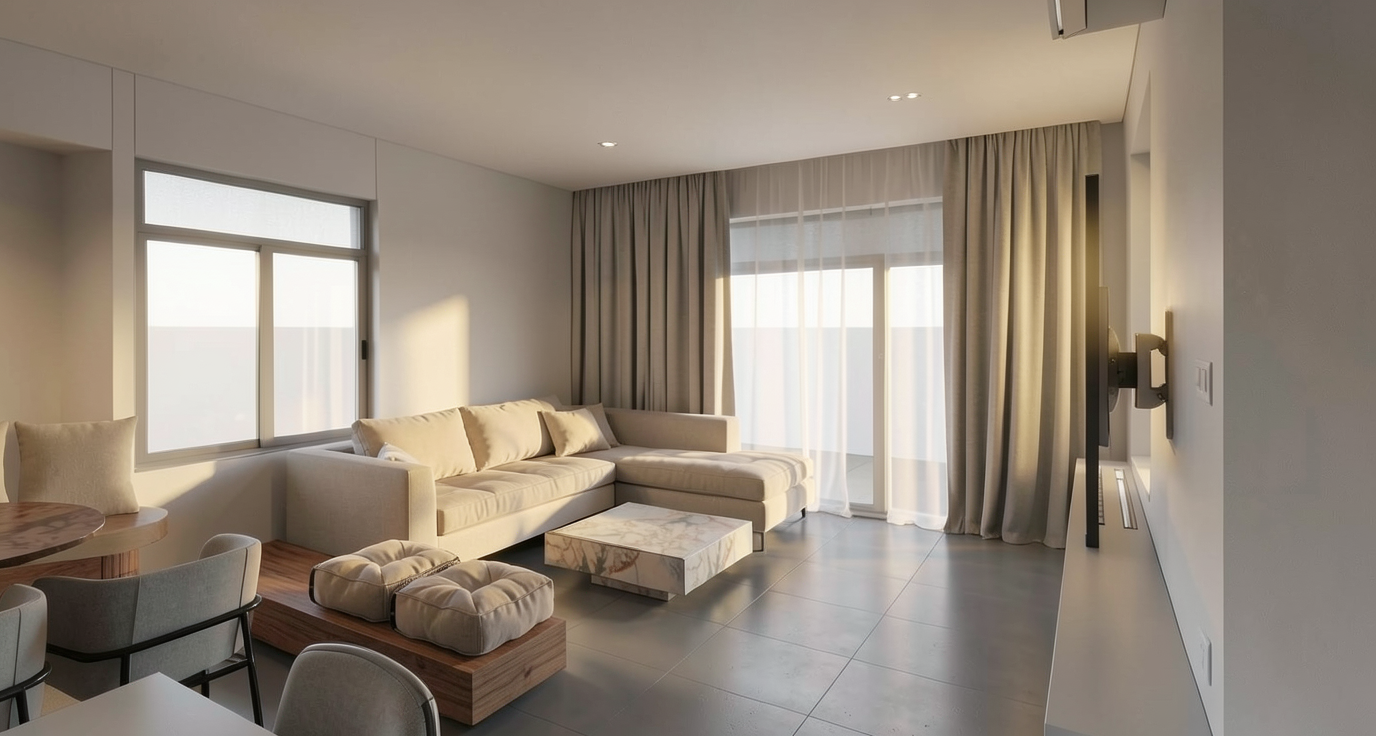 render a modern living room interior with a minimalist design creating a warm and inviting atmosphere the floor is a sleek gray adding a contemporary feel fashion the chairs with a blend of dark metal legs and light gray upholstery the lighting is soft and ambient casting gentle shadows enhancing a cozy and elegant ambiance remove the light