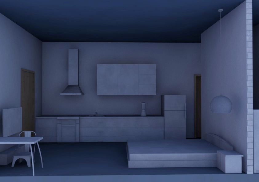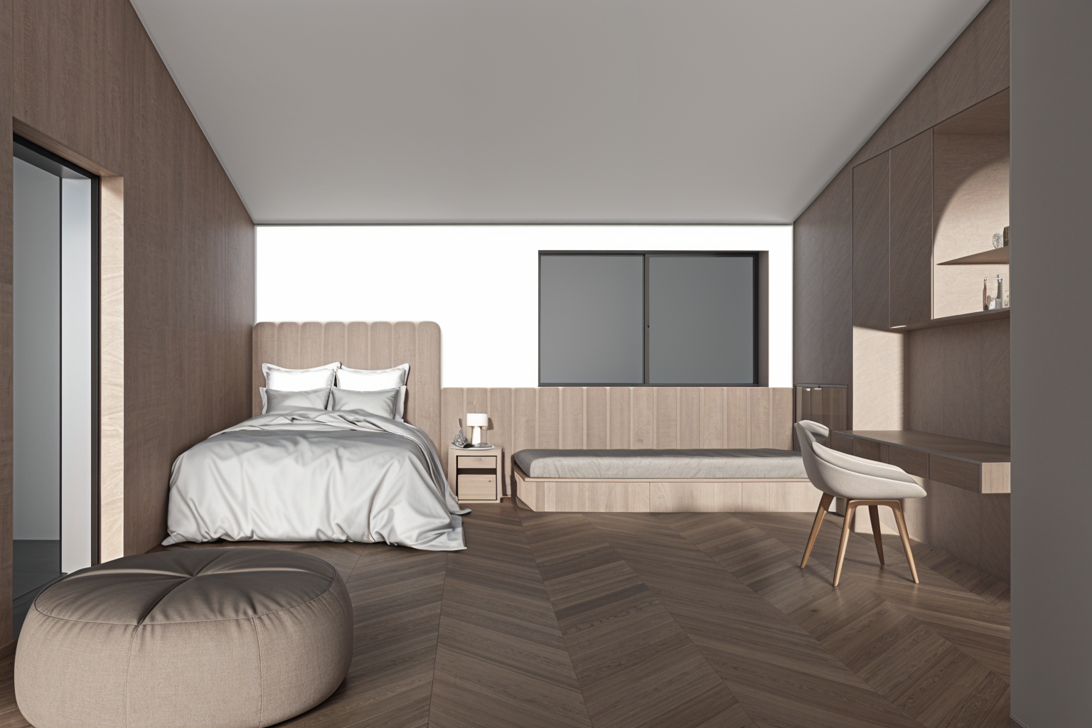 exterior shot studio bedroom desk tv and chair bed with bed table suspended light near the bed thin wall behind the bedhead kitchen with fridge in vile and beige colour wooden floor wall beige and wood colour next to the fridge there is a door to the bathroom doors are brown wood led spot around the kitchen