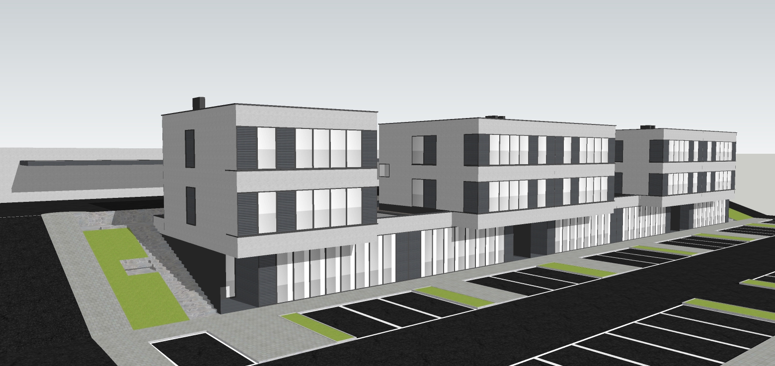 a modern architectural rendering of a rectangular building complex with a minimalist design the buildings feature clean lines and two main colors light gray for the walls and dark gray for the accents such as window frames and panels the windows are large providing a glossy reflective surface the roof is flat with small subtle protrusions the surrounding area includes a parking lot with sleek defined lines and spaces colored in dark asphalt black with white striping adjacent to the parking lot there are neatly manicured grassy areas in vibrant green the sky is clear with a soft gradient transitioning from light blue to a warmer tone near the horizon evoking a calm and serene atmosphere