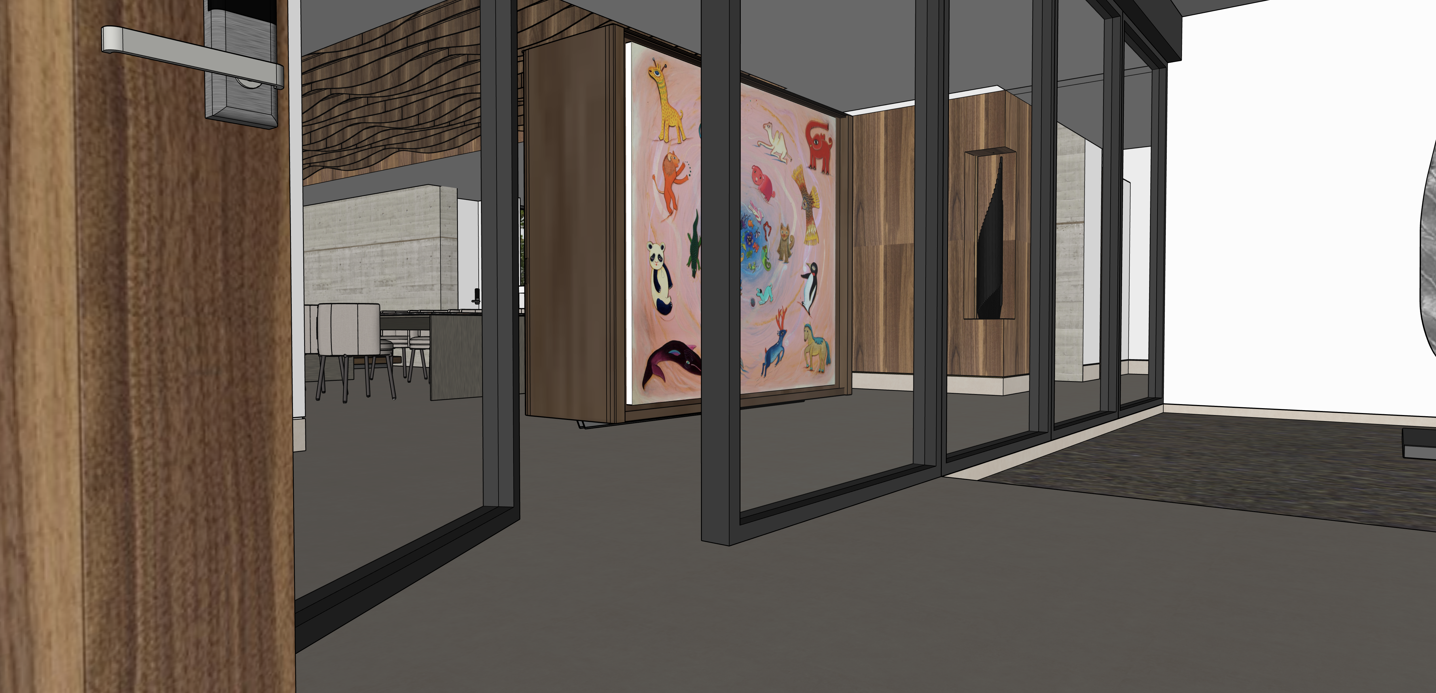 4pm view with indirect lighting and spot light in hallway and on top of painting and sculpture