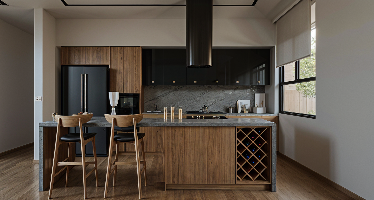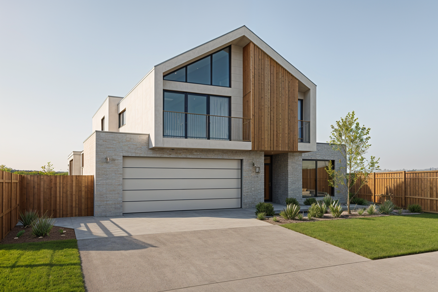 modern two story house with a sleek minimalist design the structure features a clean white facade with a contrasting section of light wood paneling on the upper right the roof is pitched with a soft grey color complementing large dark framed windows the lower level displays white brickwork enhancing the modern aesthetic the garage door is a seamless white with horizontal lines use soft turquoise for the window reflections to suggest a bright sunny day surrounding the house add sparse greenery for a touch of nature the atmosphere should be calm and contemporary with a serene suburban setting railing only to left hand side of balcony large australian native trees to the sides and a tree shadow across the driveway and facade