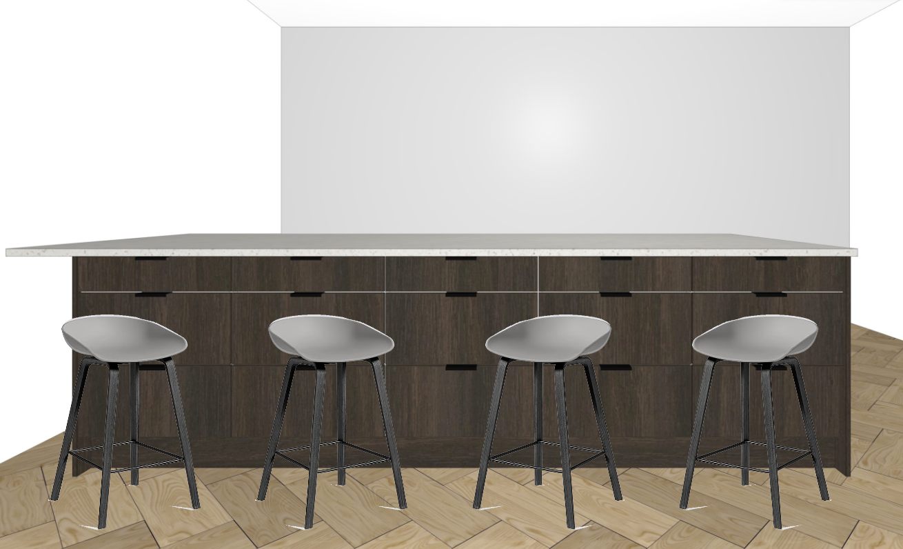 a photorealistic render of an office kitchen the floor is grey beige micro cement the walls are dark grey blue two men sitting at the stools
