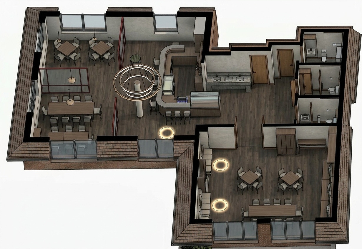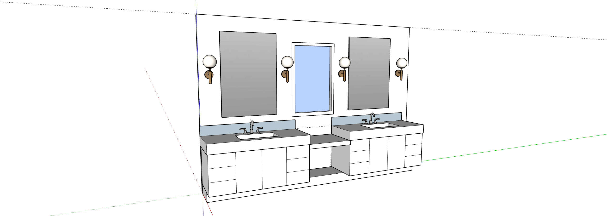 layout a symmetrical design with two separate vanity stations flanking a central open knee space like a makeup seating area between the two sinks vanities white flat panel cabinetry on both sides each with an undermount rectangular sink set into a grey stone countertop the countertop extends across the full width bridging over the center gap wall elements from left to right rectangular vertical mirror above the left sink globe sconce with bronze brass arm taller rectangular vertical window in the center the dark blue element showing sky or exterior beyond another globe sconce with bronze brass arm rectangular vertical mirror above the right sink two additional globe sconces on the outer edges backsplash a thin horizontal sky blue strip runs along the wall just above the countertop behind both sinks faucets what appear to be bridge style or traditional faucets in a darker finish bronze or oil rubbed bronze matching the sconce hardware overall vibe clean modern traditional the white cabinetry and stone counters keep it fresh while the bronze fixtures and globe sconces add warmth the center window is a nice touch for natural light between the two mirrors