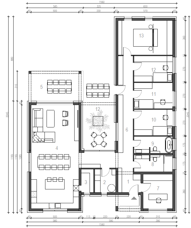 convert this floor plan into a realistic isometric 3d view of a full house show the space from an elevated angle with furniture walls and details visible remove outdoor attached terace by number 5 use the same furniture as shows on the plan do not change the orientation of the floorplan
