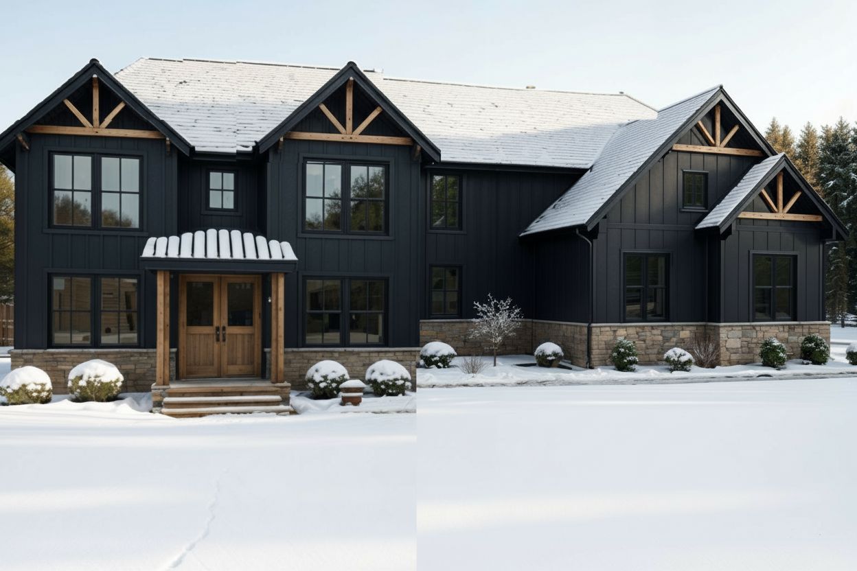 dark blue siding black trim around every window black soffit at roof peaks black gutters
