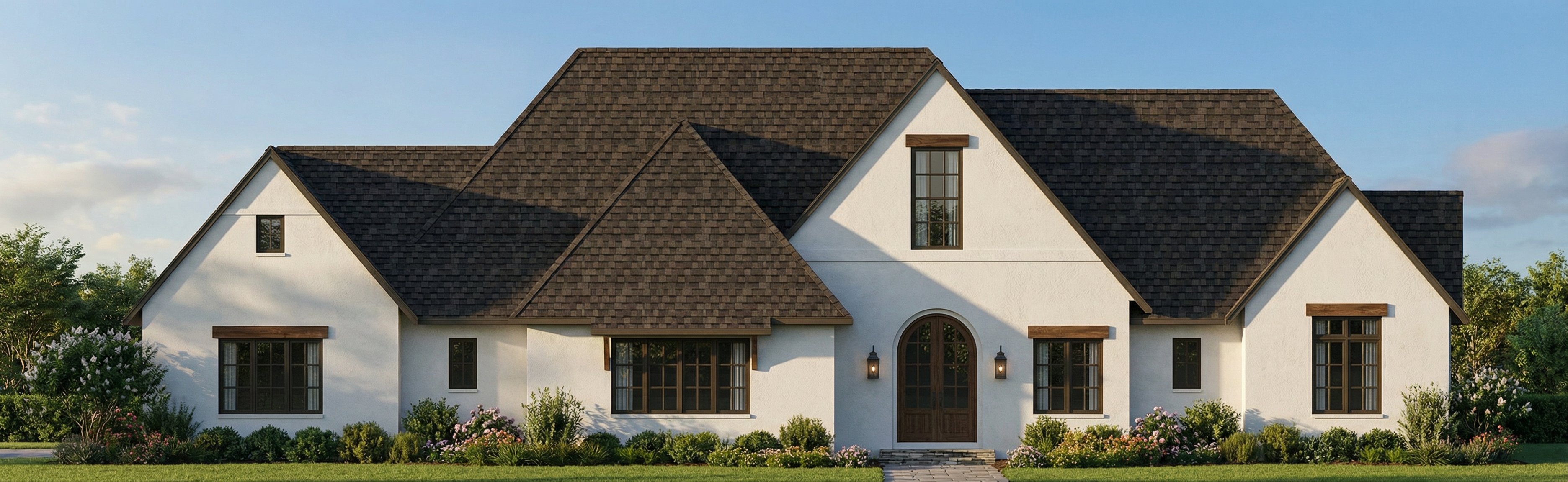 detail shot of an antique brick house with a soldier course at the top of brick walls with timber columns steel beams reclaimed pine soffit yellow pine trees in the background clouds in the sky lake inlet in the foreground landscape to be tall wild louisiana grasses horizon line to be filled with bald cypress and yellow pine add a kayaker under the bridge have people walking across bridge add people under porches have the pond span from behind the boat slip house to the front of the middle 3 cottages