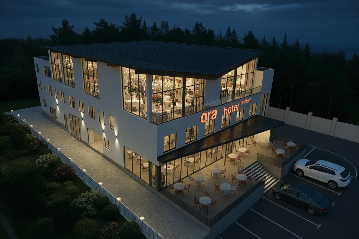 inlocuieste ultimul etaj cu sala de evenimente cu un etaj la care acoperisul sa fie de forma celui din imaginea de referinta